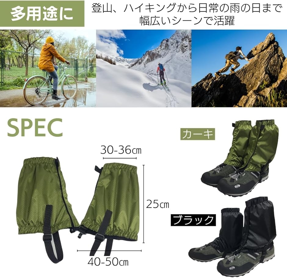 「多用途に対応」このゲイターは、雪山登山、キャンプ、ハイキング、トレッキングなどのアウトドア活動だけでなく、通勤や通学、ツーリングなど日常生活でも大活躍。