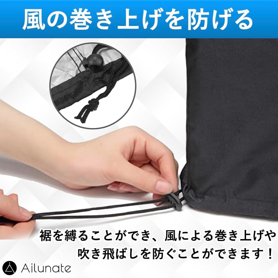 「風の吹上げを防げる」裾を紐で縛ることができ、風による巻き上げや吹き飛ばしを防ぐことが可能です。