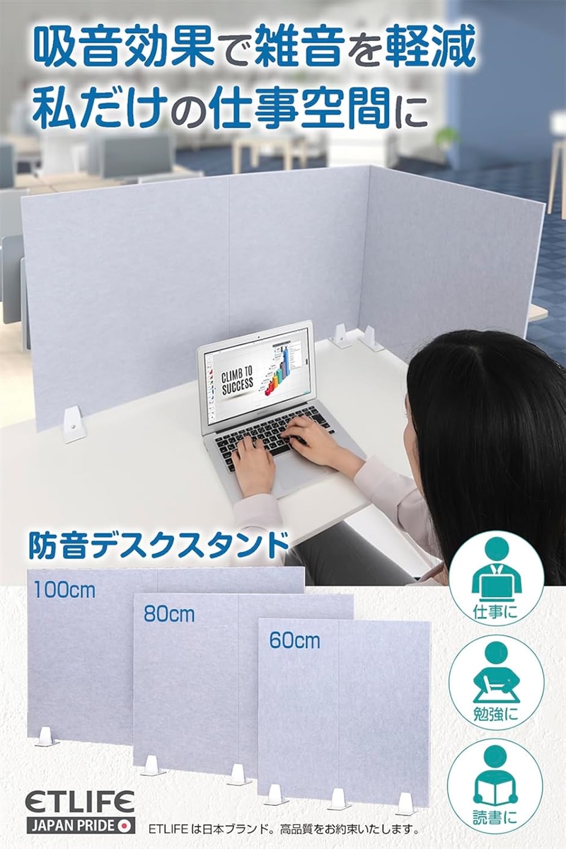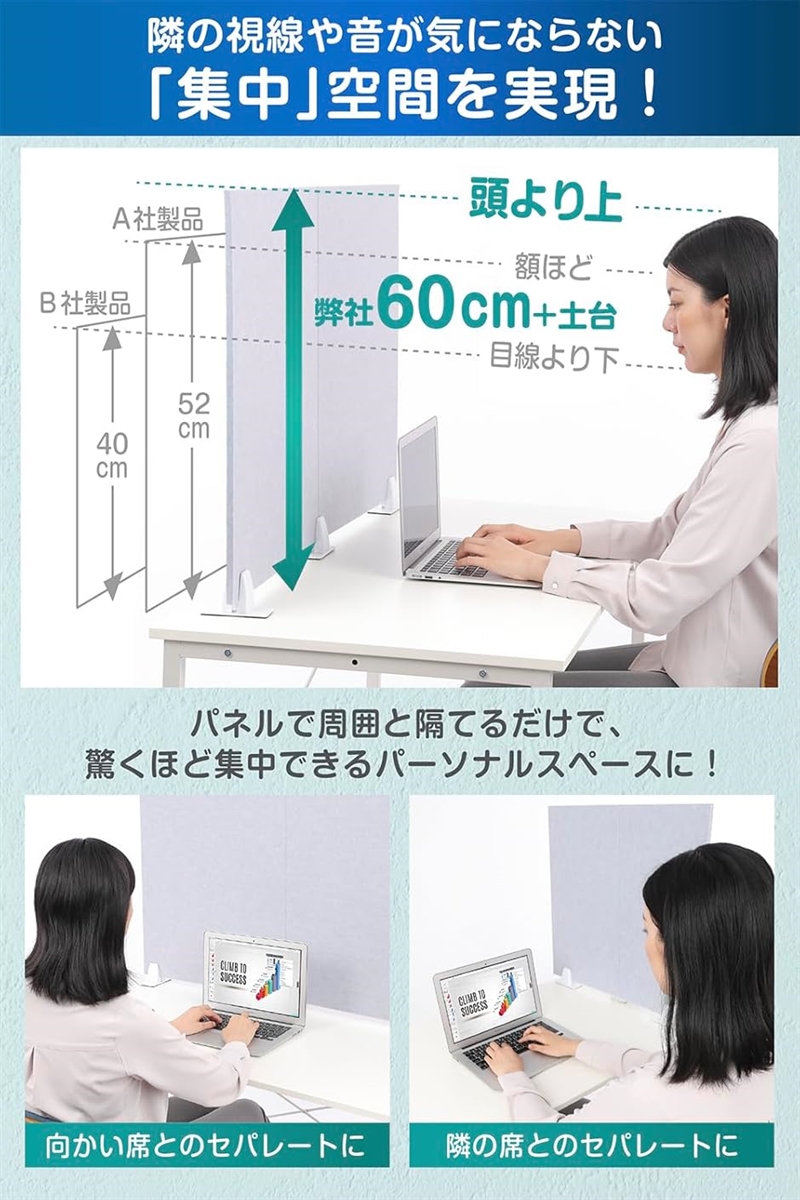 視線が気にならない集中空間 : 卓上から高さは一般的な40〜50cmでは無く、60cm にアップグレード。