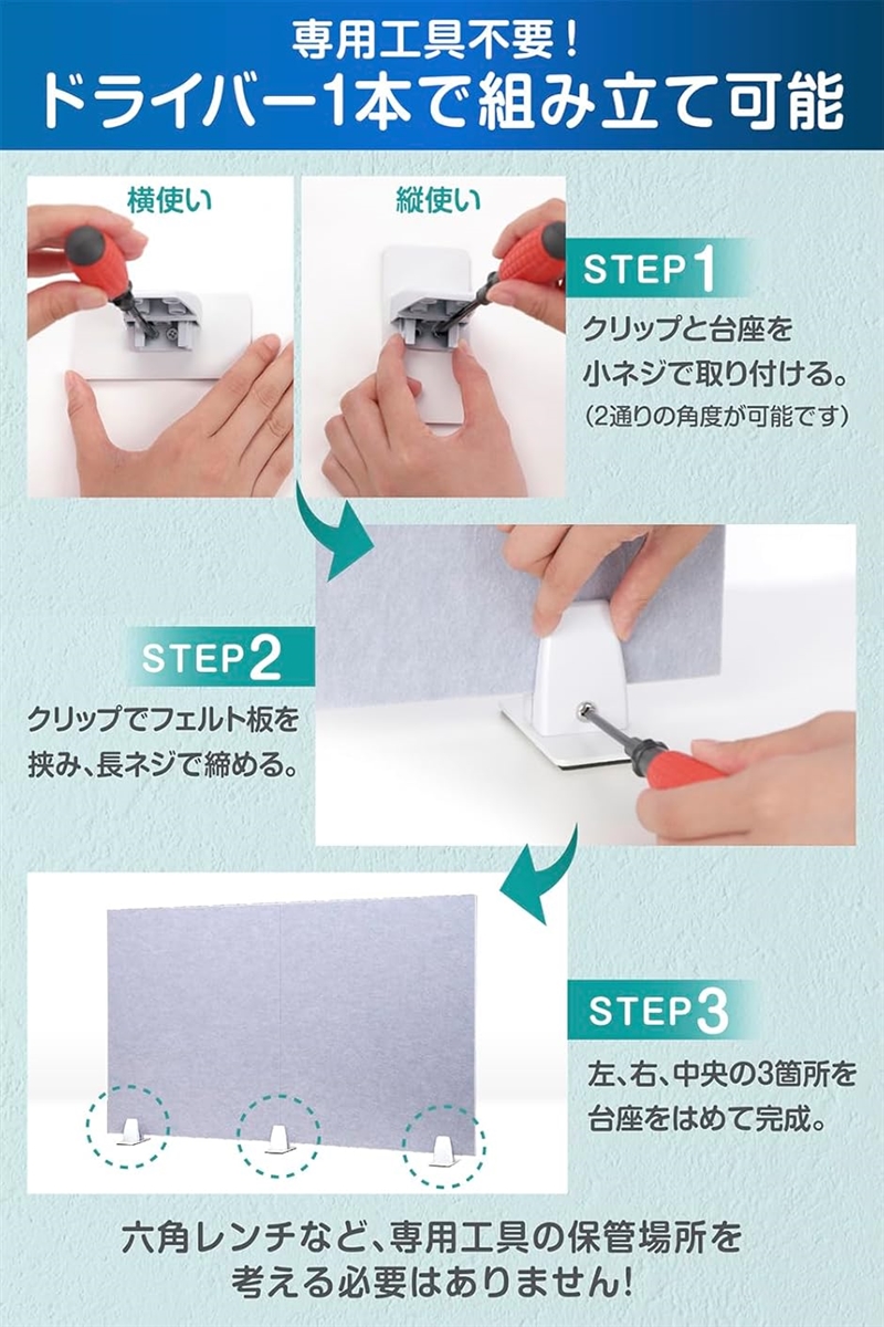 商品セット内容: パーテーション本体 1枚、台座(板・クリップ)各3つ、ネジ(小・大) 各3つ *ドライバーは付属していません。