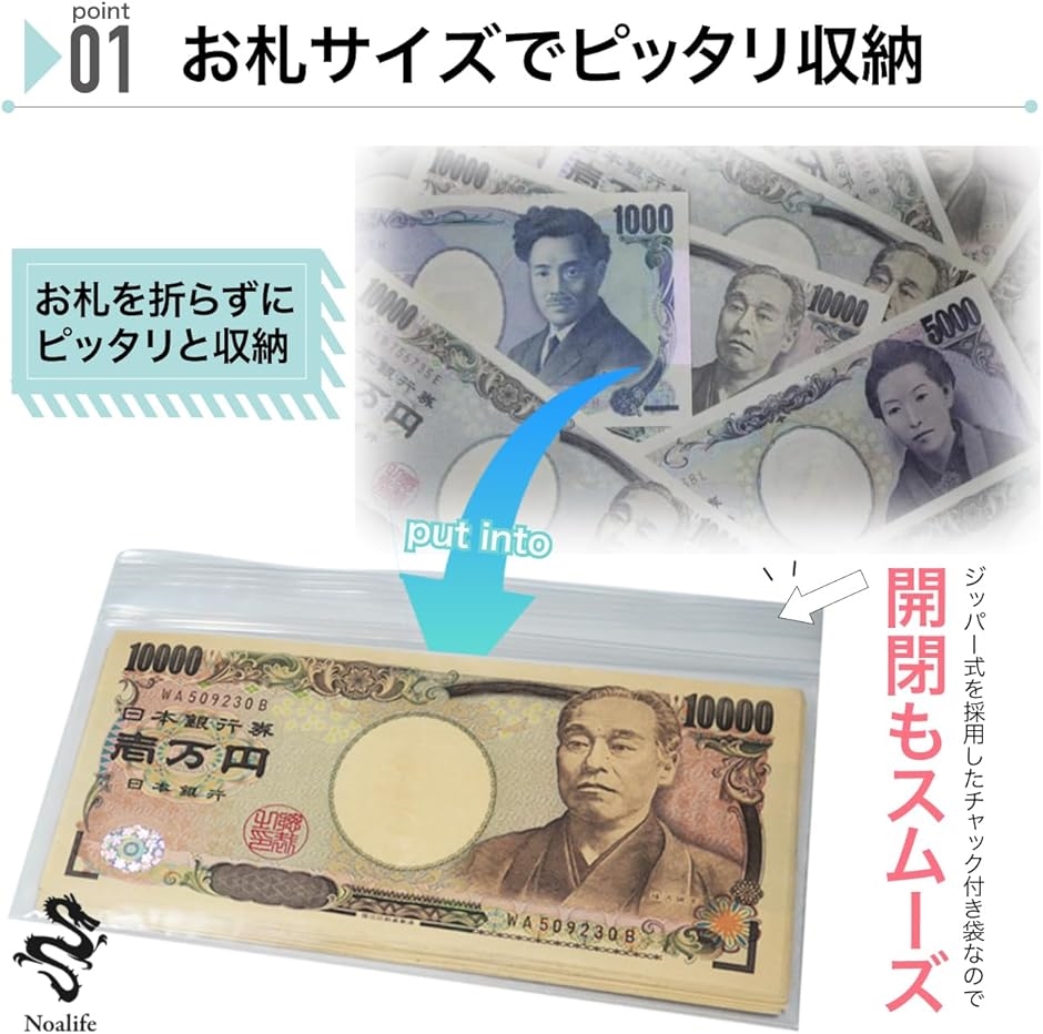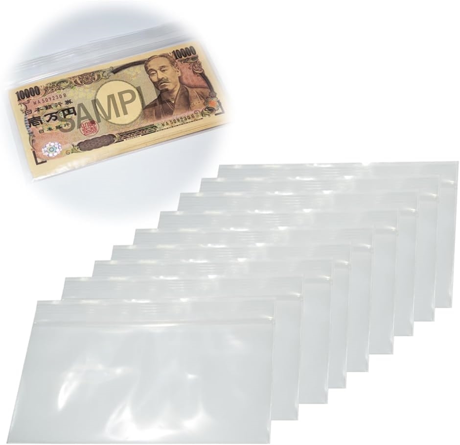 お札サイズでピッタリ収納:こちらのチャック付きポリ袋 お札用は横型なので、お札を折らずにピッタリと収納することができます。