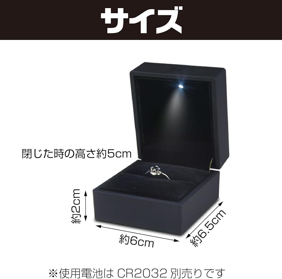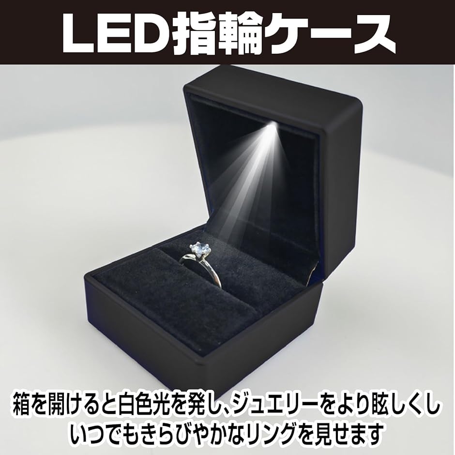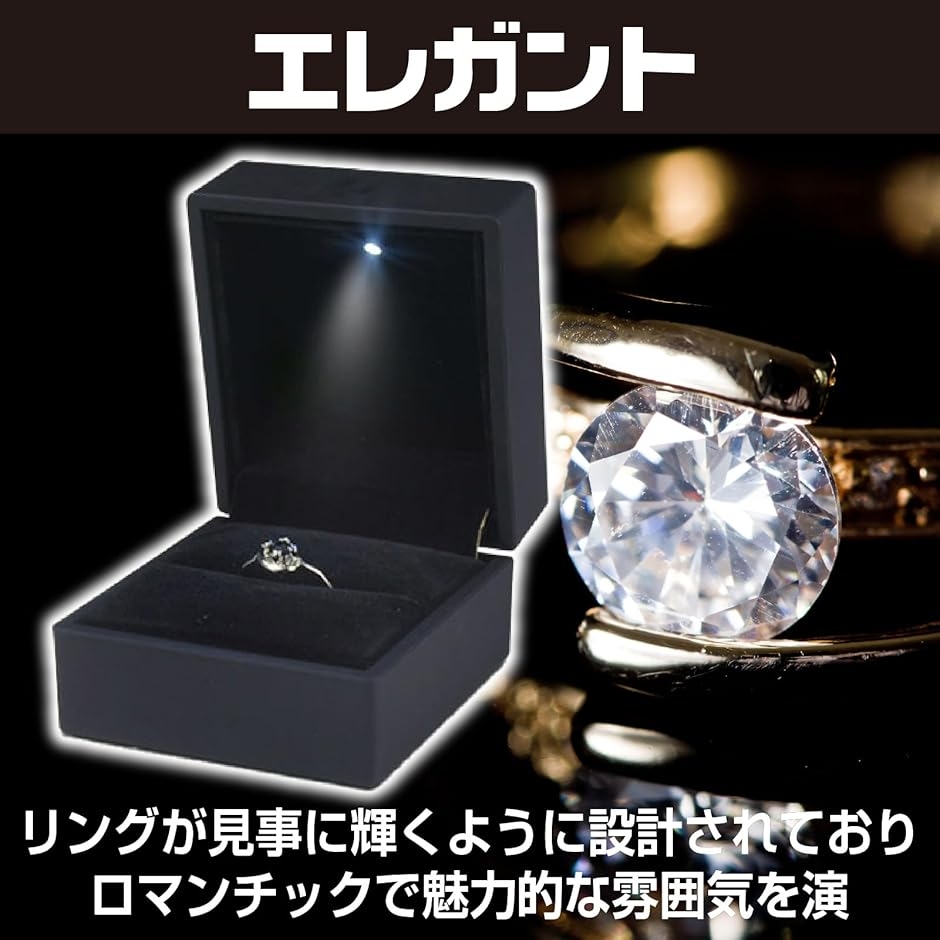 「LEDライト付きで指輪を美しく演出」 この指輪ケースは、内部に小さなLEDライトが取り付けられており、箱を開けると白色光が指輪を美しく照らします。