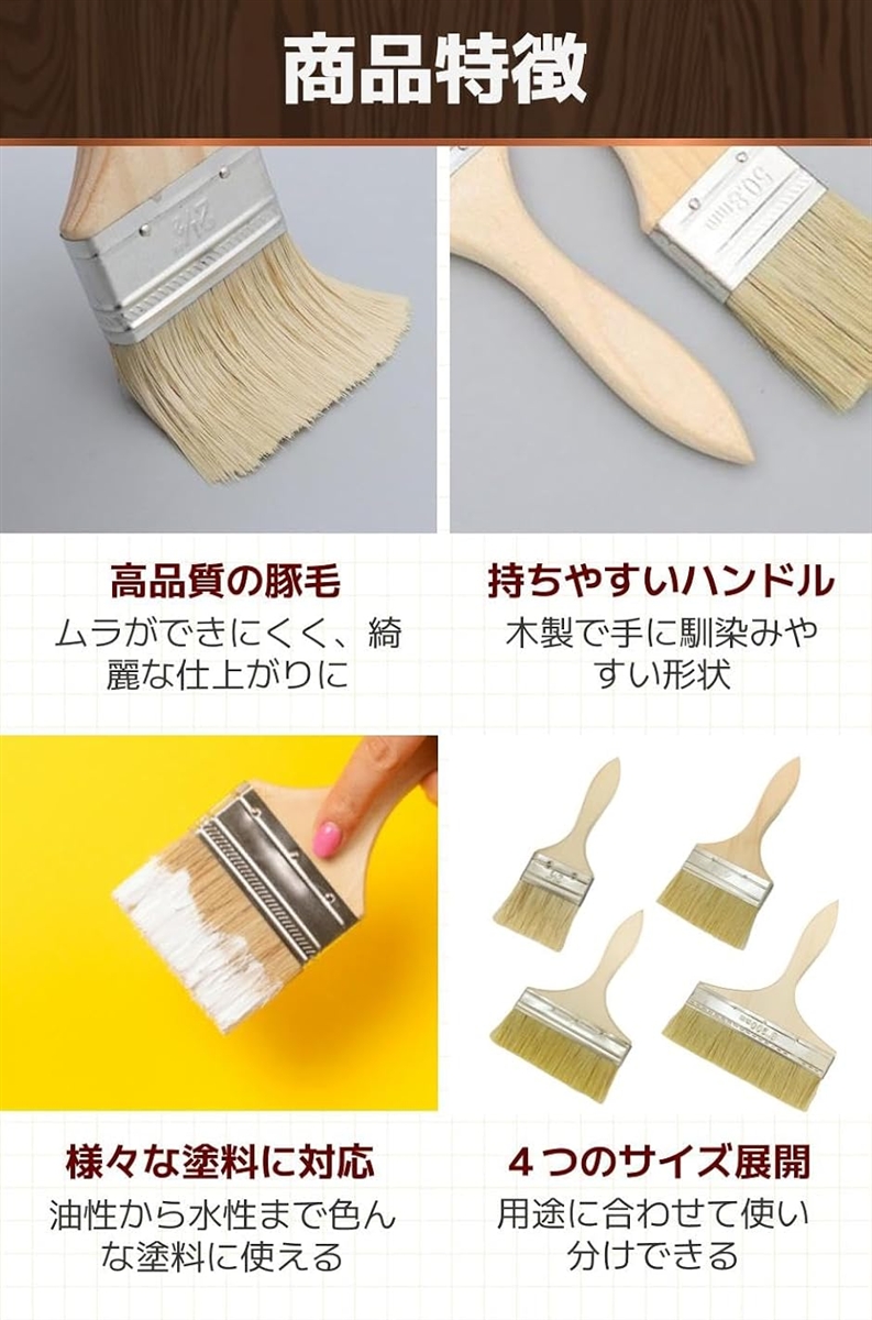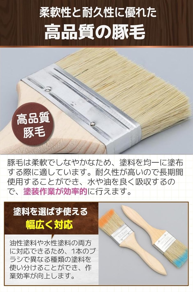 「高品質の豚毛」豚毛は柔軟でしなやかなため、塗料を均一に塗布する際に適しています。