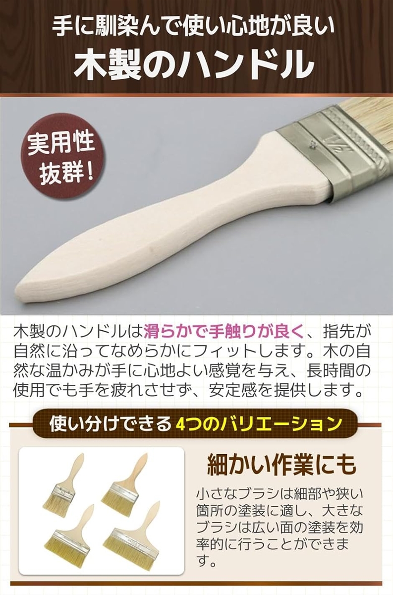 「細かい作業にも」小さなブラシは細部や狭い箇所の塗装に適し、大きなブラシは広い面の塗装を効率的に行うことができます。