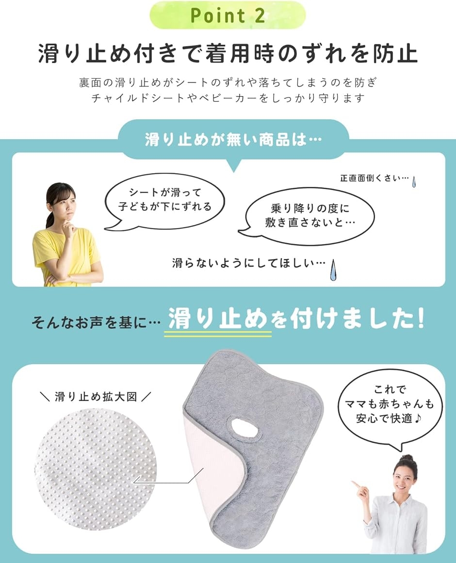 「滑り止め付き」裏面には滑り止め付き。シートがずれたり落ちてしまうのを防ぎ、チャイルドシートやベビーカーをしっかり守ります。