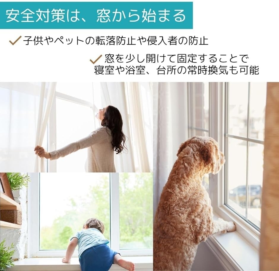 「全家族を守る、強力窓ロック」最適な開き幅で窓を固定し、お子様やペットの不慮の転落を防ぎます。
