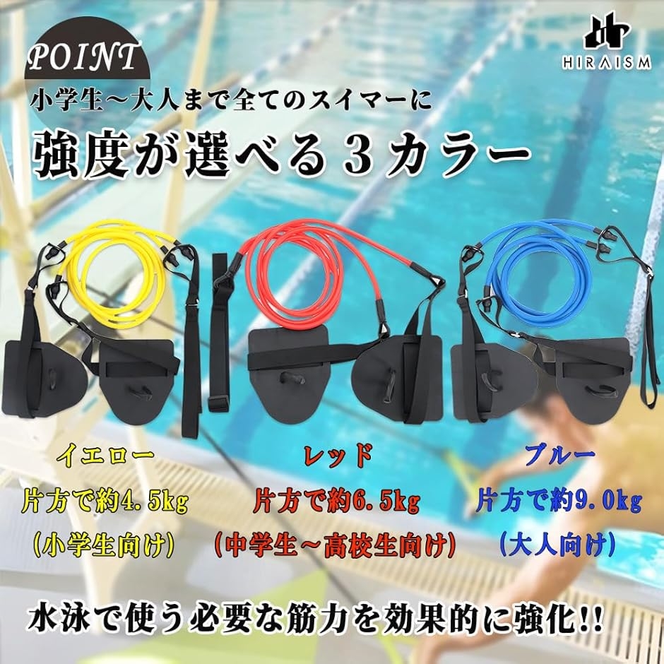 強度が選べるので、小学生から大人まで、全てのスイマーに最適なトレーニングアイテムです。