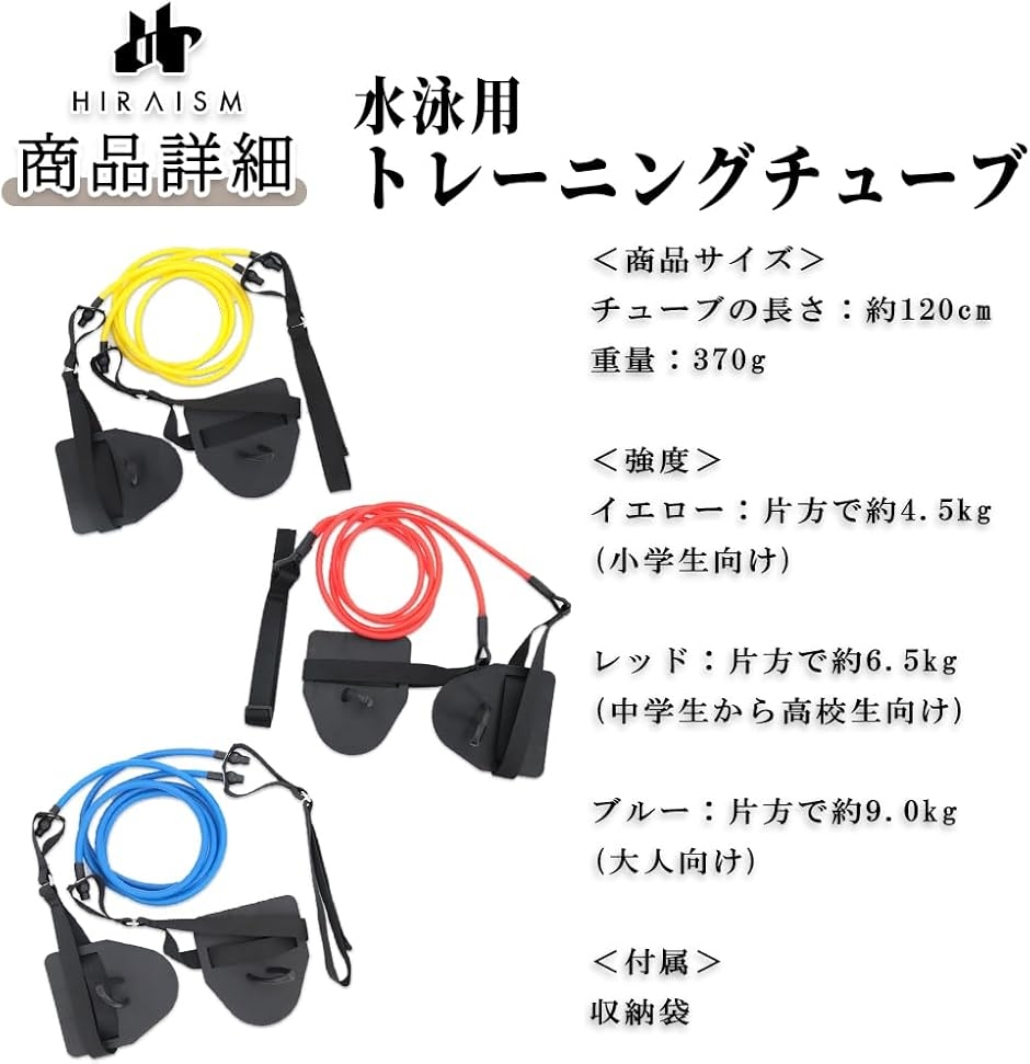 「商品内容」水泳用トレーニングチューブ <強度>イエロー:片方で約4.5kg(小学生向け) レッド:片方で約6.5kg(中学生から高校生向け) ブルー:片方で約9.0kg(大人向け) <付属>収納袋