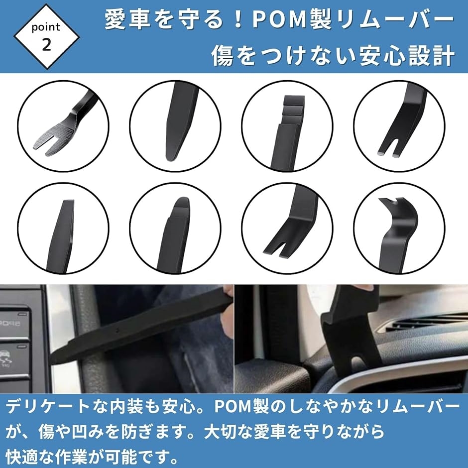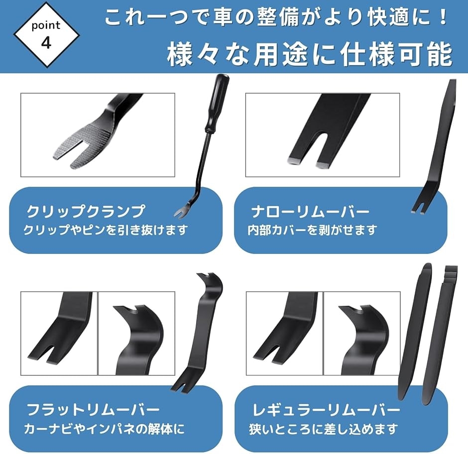トリム、ドアパネル、モールディング、ウィンドウトリム、クリップ、ファスナー、エンブレムなど、様々な内外装パーツの取り外しに対応でき、汎用性が高いです。