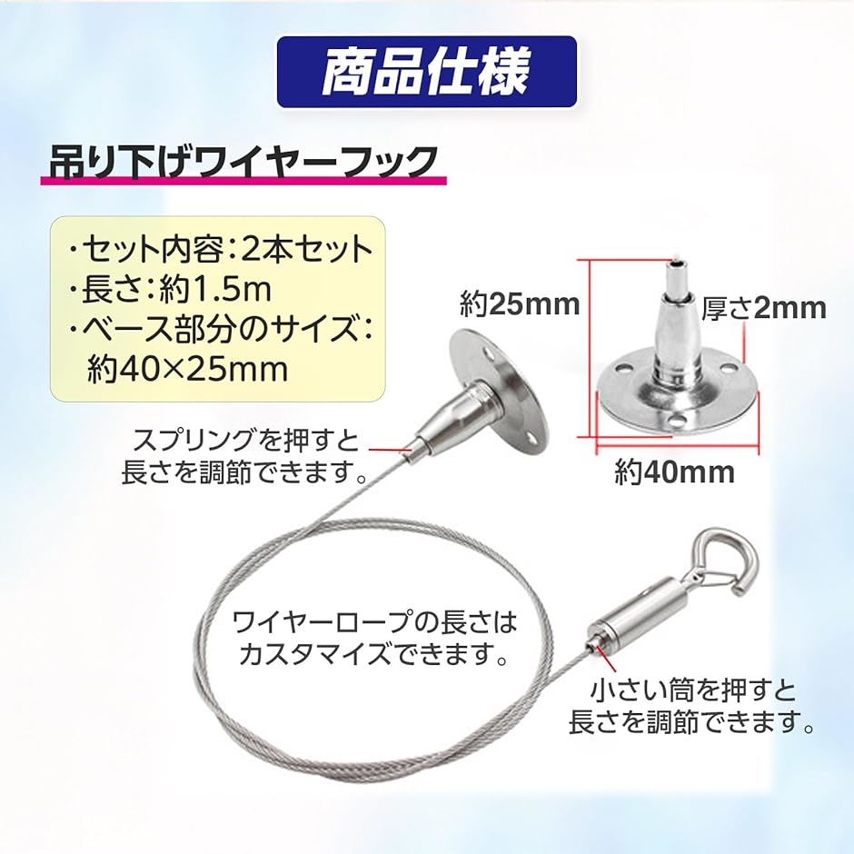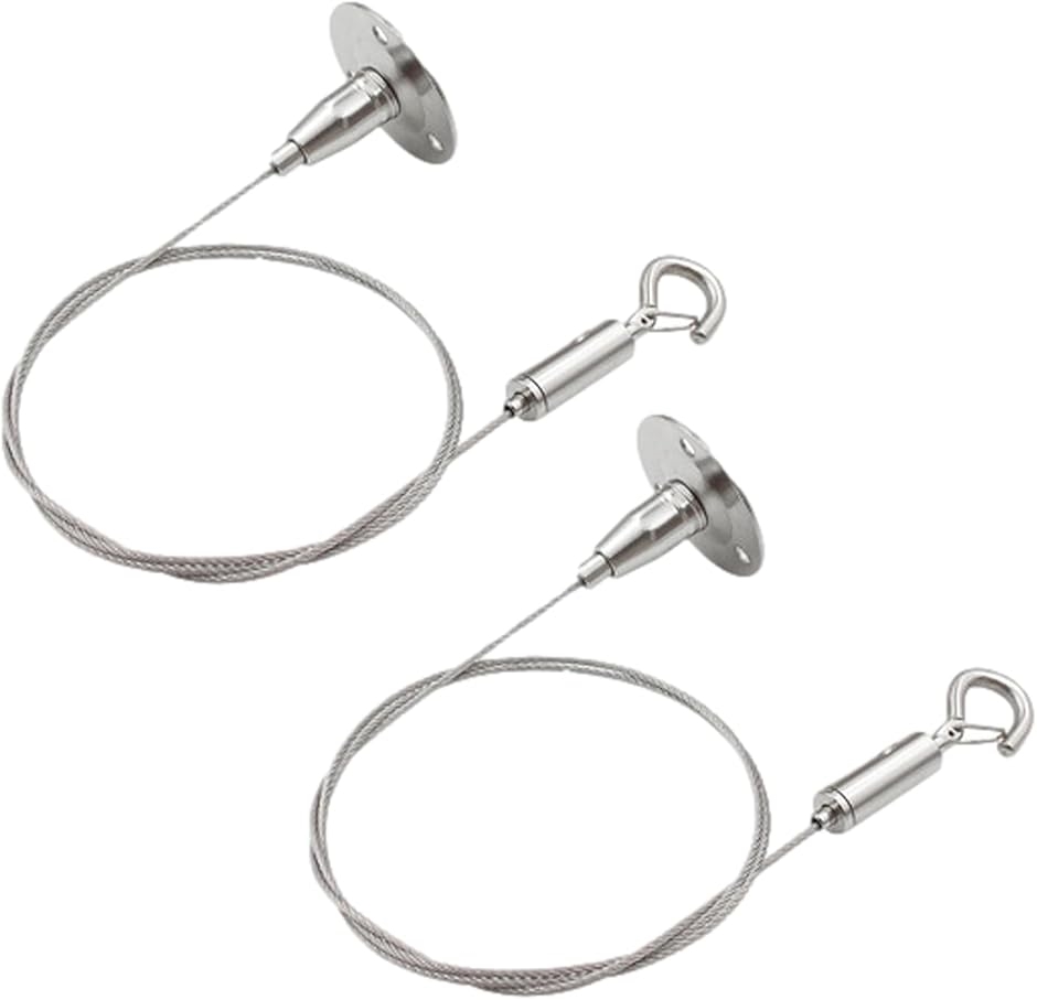 | 商品名 | 吊り下げ ワイヤー フック 2本セット 天井 吊り下げ金具 落下防止 調節可能 額縁 壁掛け 長さ1.5m |