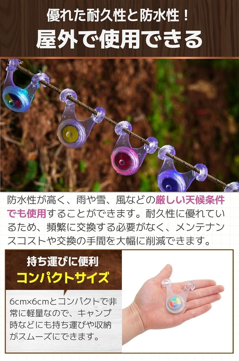 「商品特徴」(1)発光力が高いLED:強い発光力で広範囲に照明を提供します/(2)柔らかいシリコン素材:様々なものに取付けしやすい/(3)5つのカラー展開:様々な色を組み合わせて楽しめる/(4)嬉しい10個セット:一度に多くの場所に設置が可能