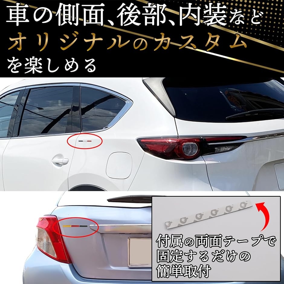「内装・外装どちらでも」車のフロント、フェンダー、サイドドア、バックドアなど外装ステッカーとして取り付けるのはもちろん、収納ボックスなどの内装カスタムにもお使いいただけます。