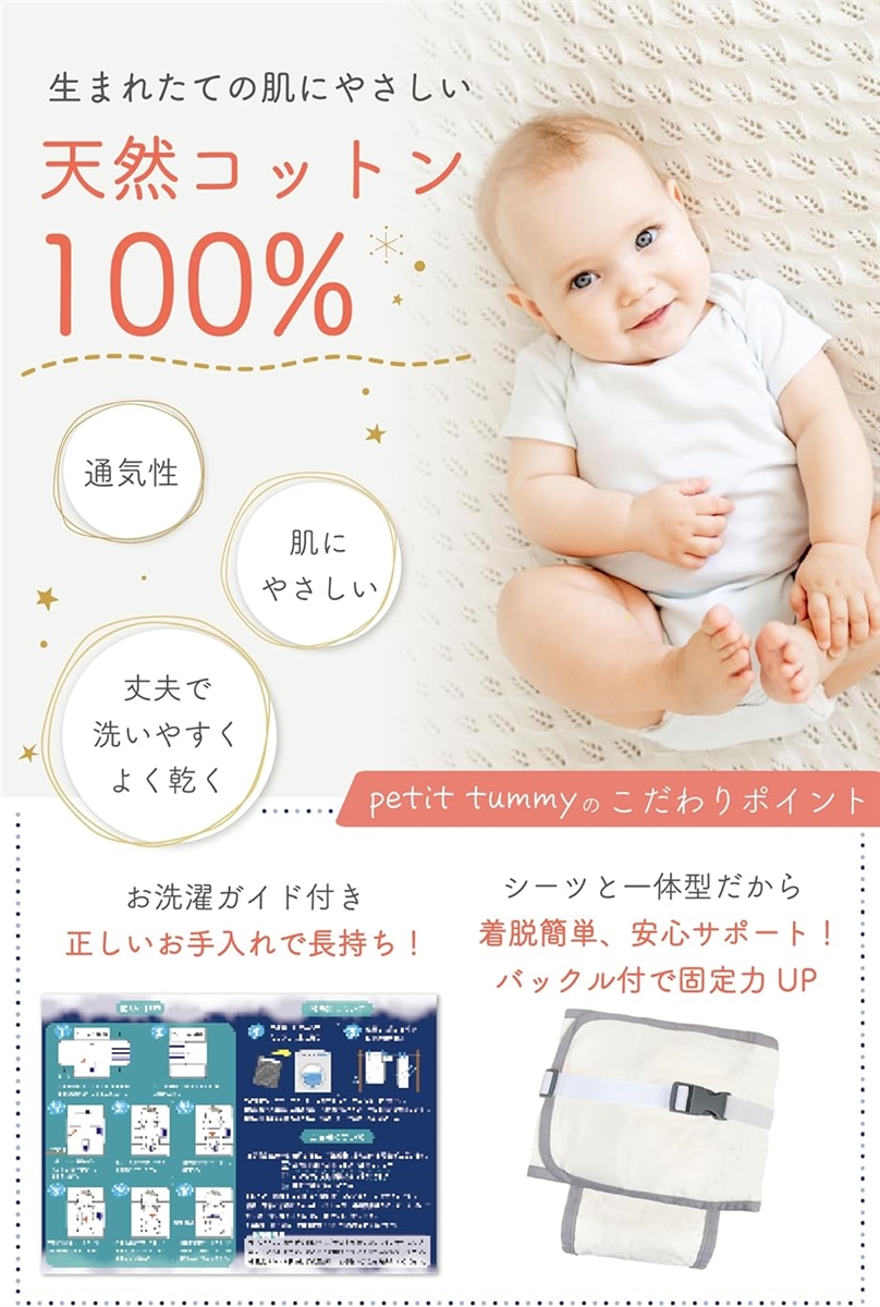 「自然素材」布は100%コットン素材を使用しているため、繊細な赤ちゃんの肌にも安心してお使いいただけます。
