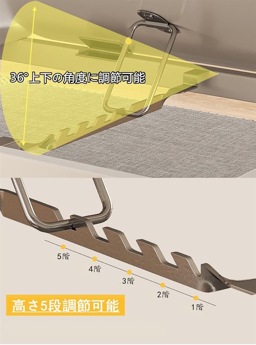 「角度調整可能」天板の角度が0°から36°の範囲で5段階に変換可能ノートパソコン、タブレット、モバイル、雑誌視聴を調整できます。