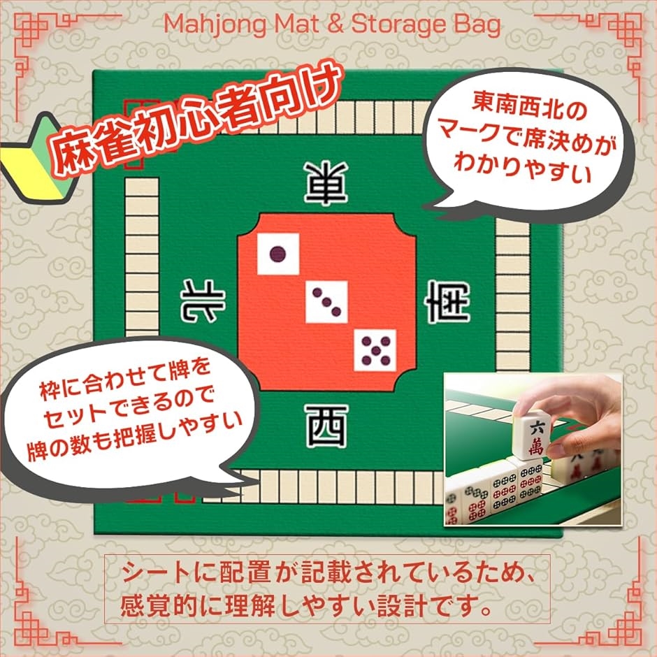 「初心者にも安心。幅広いユーザーに最適な設計」 この麻雀マットは、初心者がルールを学ぶための練習にも最適な設計です。