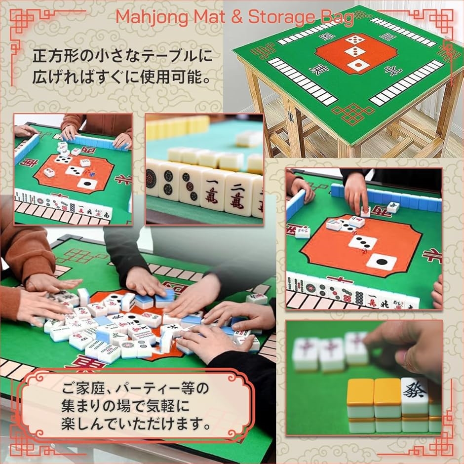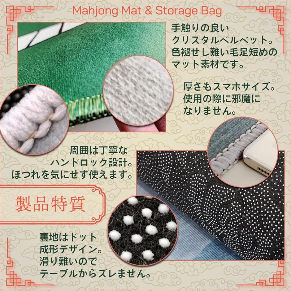 「セット内容」麻雀マットx1、収納袋x1「サイズ」麻雀マット:約70cmx70cm、収納袋:約85cmx15cm