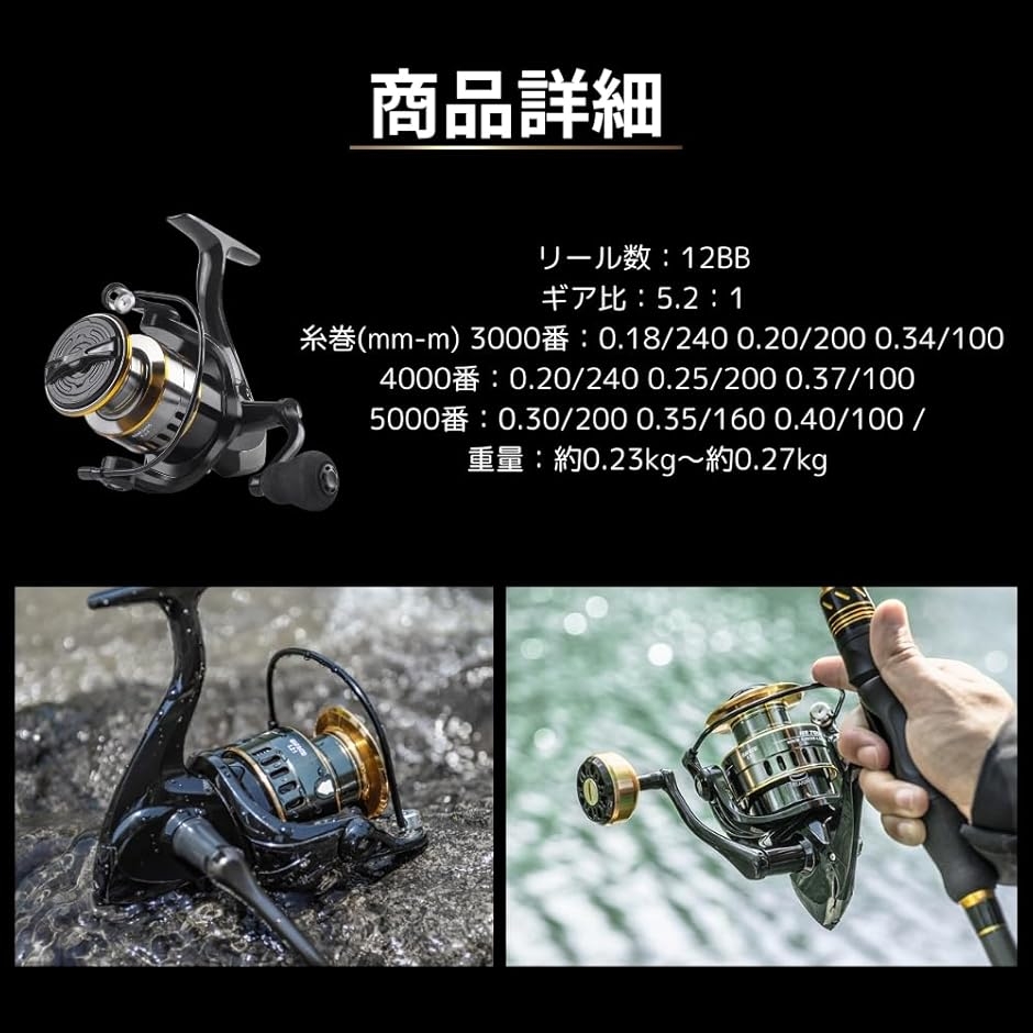 「製品詳細」リール数:12BB / ギア比:5.2:1 / 糸巻(mm-m) 3000番:0.18/240 0.20/200 0.34/100、4000番:0.20/240 0.25/200 0.37/100、5000番:0.30/200 0.35/160 0.40/100 / 重量:約0.23kg〜約0.27kg