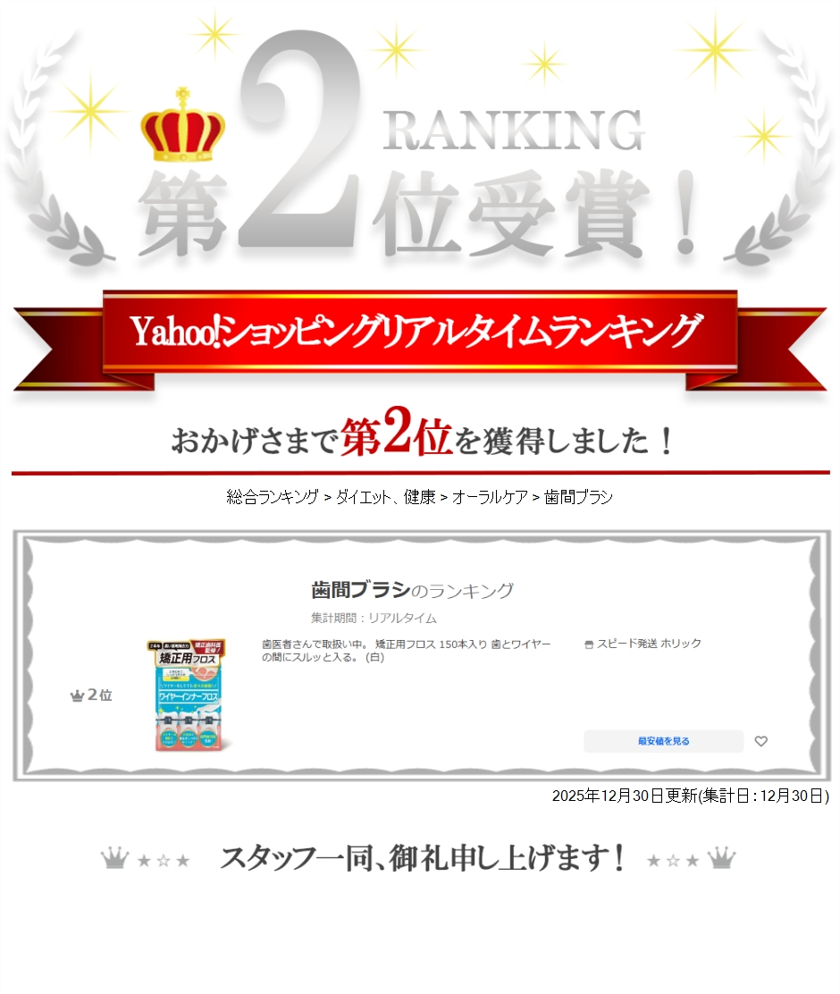 | 商品名 | 歯医者さんで取扱い中。 矯正用フロス 150本入り 歯とワイヤーの間にスルッと入る。 |