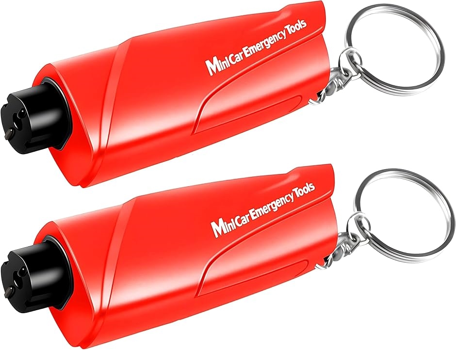「セット内容」緊急脱出ハンマー 2個セット、携帯に便利なキーホルダー付き、前もって破壊のシュミレーションが出来るテスト用ガラスが付属致します