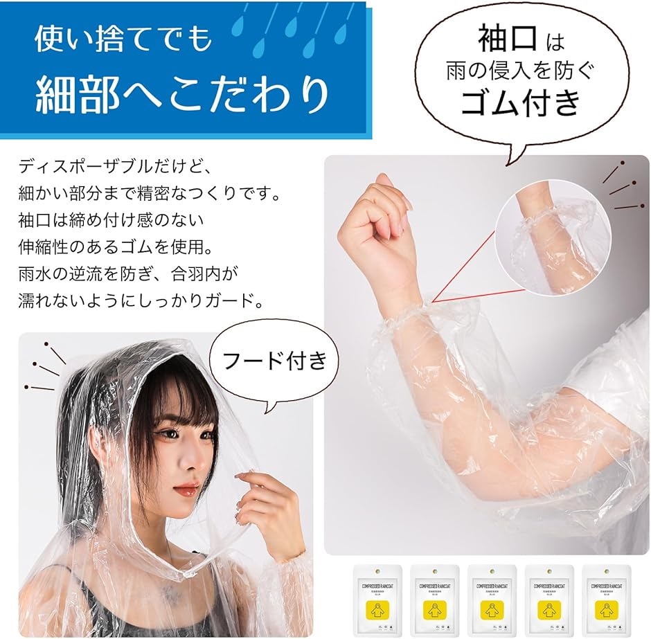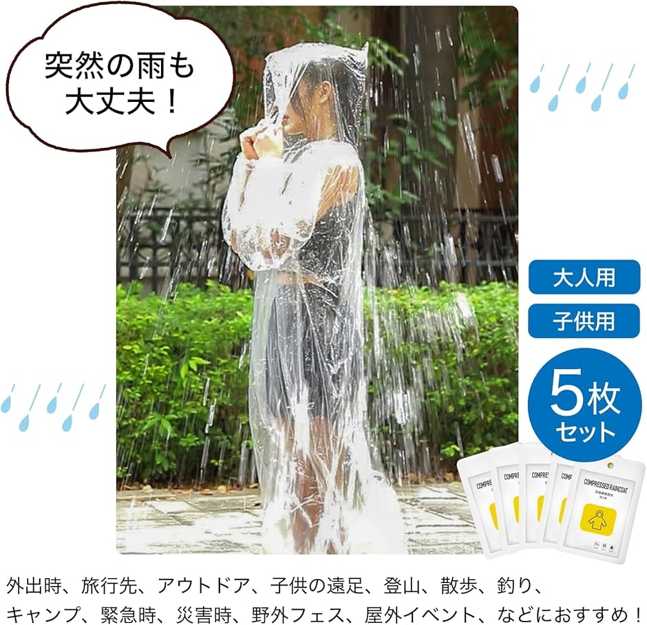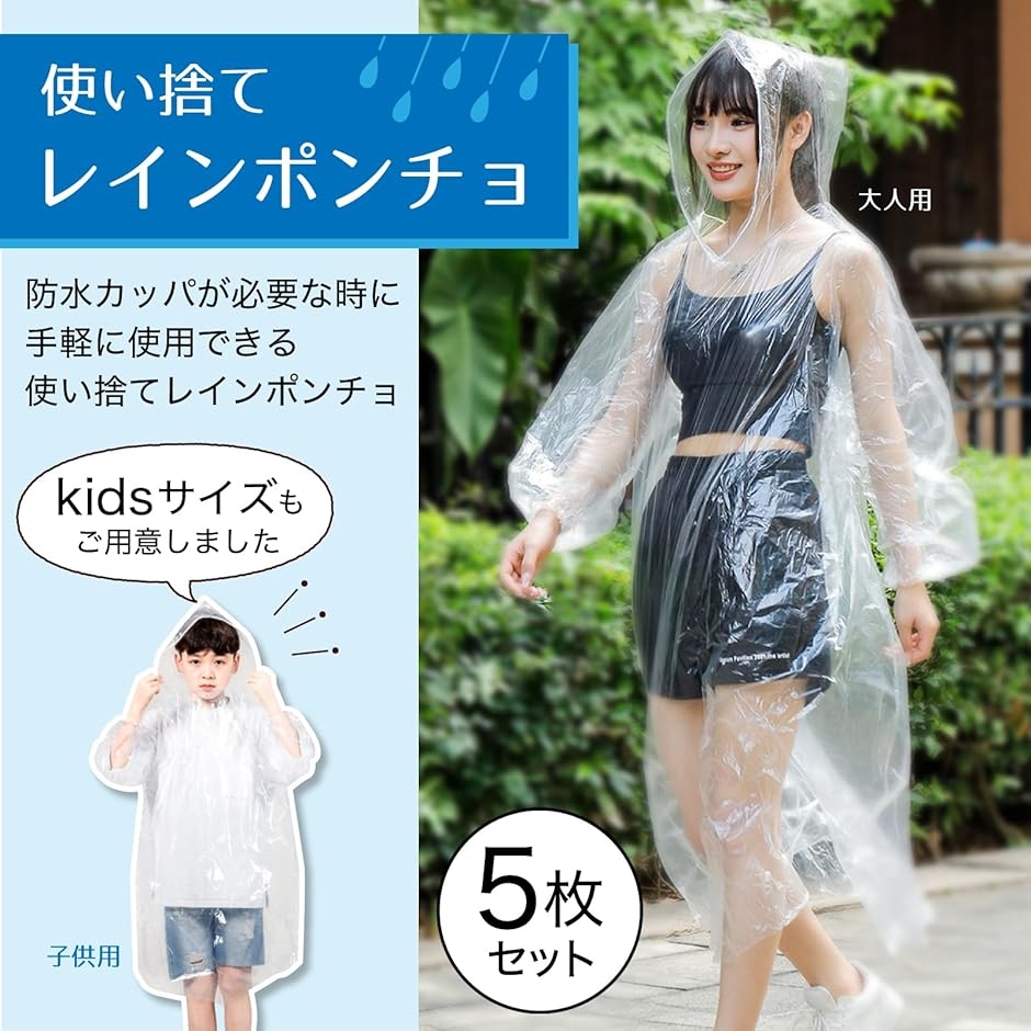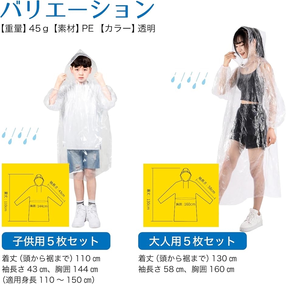 | 商品名 | 使い捨て レインコート 5枚セット 大人 子供 レインポンチョ 個包装 防災 透明 防水 カッパ 子供用5枚セット |