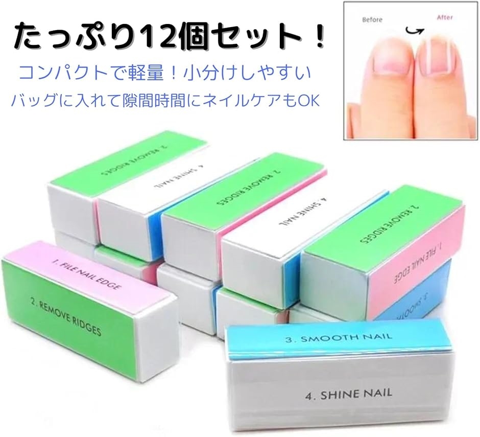 「商品内容」爪磨き:12個セット やすり:4面 サイズ:3.6x9x3cm 重量:5g / 個 備考:男女共用 保護フィルム付き。