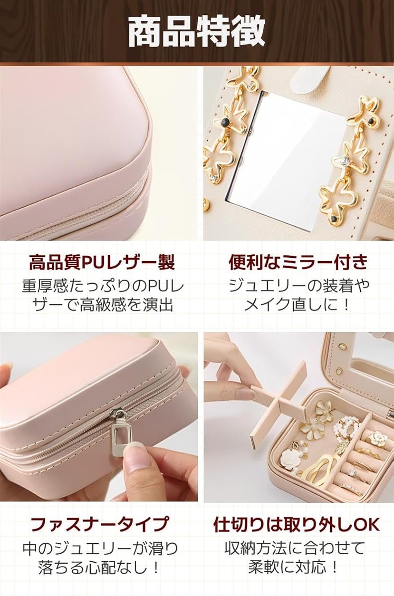 「商品特徴」(1)高品質PUレザー製:重厚感たっぷりのPUレザーで高級感を演出/(2)便利なミラー付き:ジュエリーの装着やメイク直しに。/(3)ファスナータイプ:中のジュエリーが滑り落ちる心配なし。/(4)仕切りは取り外しOK:収納方法に合わせて柔軟に対応。