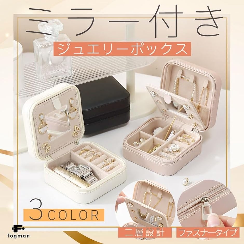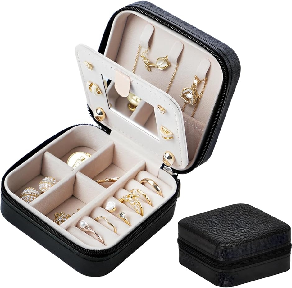 「商品特徴」(1)高品質PUレザー製:重厚感たっぷりのPUレザーで高級感を演出/(2)便利なミラー付き:ジュエリーの装着やメイク直しに。/(3)ファスナータイプ:中のジュエリーが滑り落ちる心配なし。/(4)仕切りは取り外しOK:収納方法に合わせて柔軟に対応。