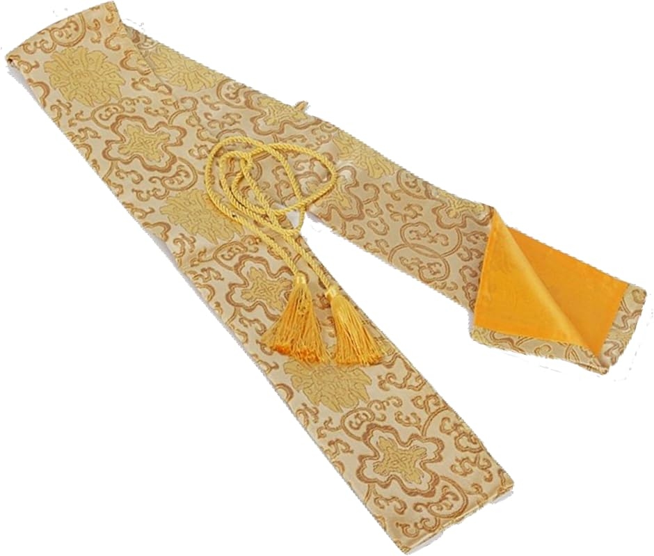 スタイル・柄:牡丹 金(画像参照) ・寸法:刀袋 幅約13cmx長さ133cm(折り返し約20cm、収納刀剣の長さは110cm以下)、金紐 長さ約115cm(色・柄により寸法に多少の誤差がみられる場合があります) ・重量:約95g(紐を含む)