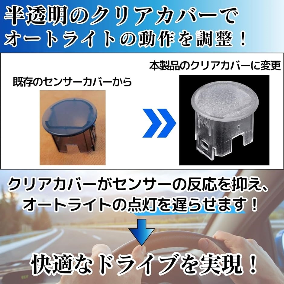 半透明のセンサーカバーに交換することで、オートライトの感度を下げ、通常よりもオートライトの点灯を遅らせることが出来ます。