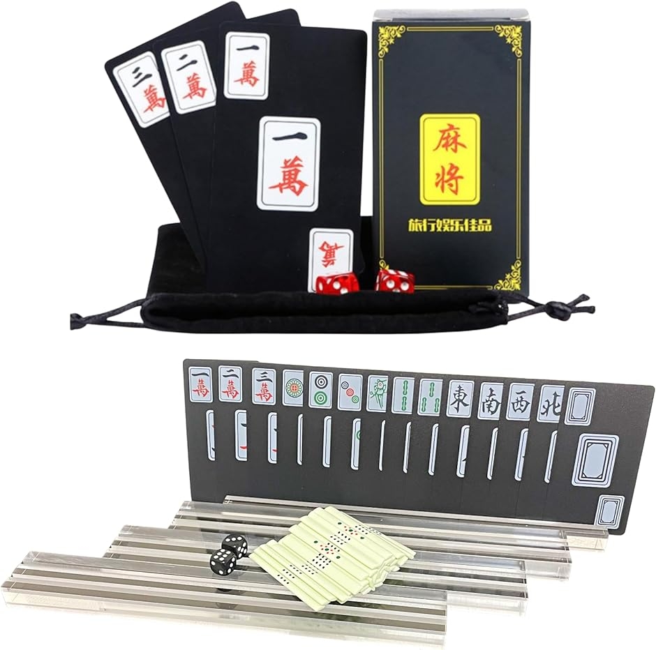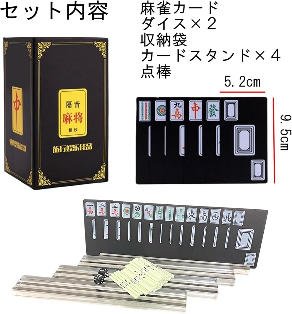 セット内容:麻雀カード、サイコロx2個、収納袋、カードスタンドx4個、点棒 カードサイズ:9.5x5.2m 重さ:360g
