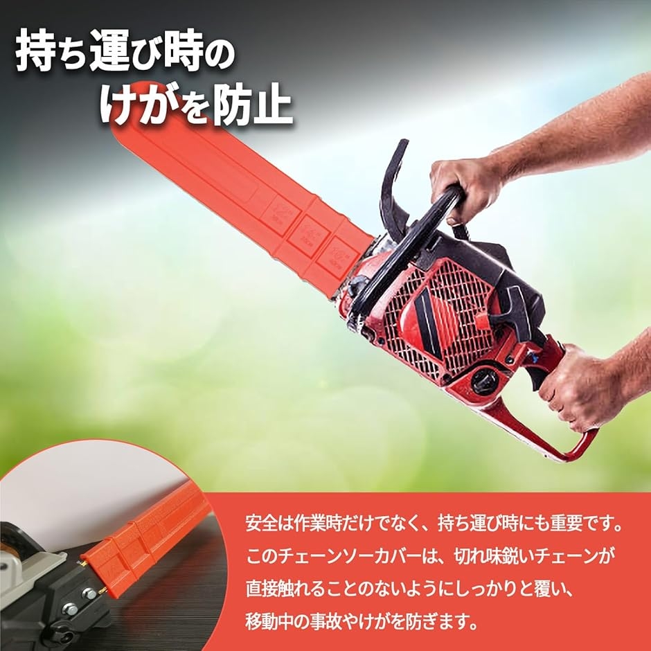 このチェーンソーカバーは、切れ味鋭いチェーンが直接触れることのないようにしっかりと覆い、移動中の事故やけがを防ぎます。