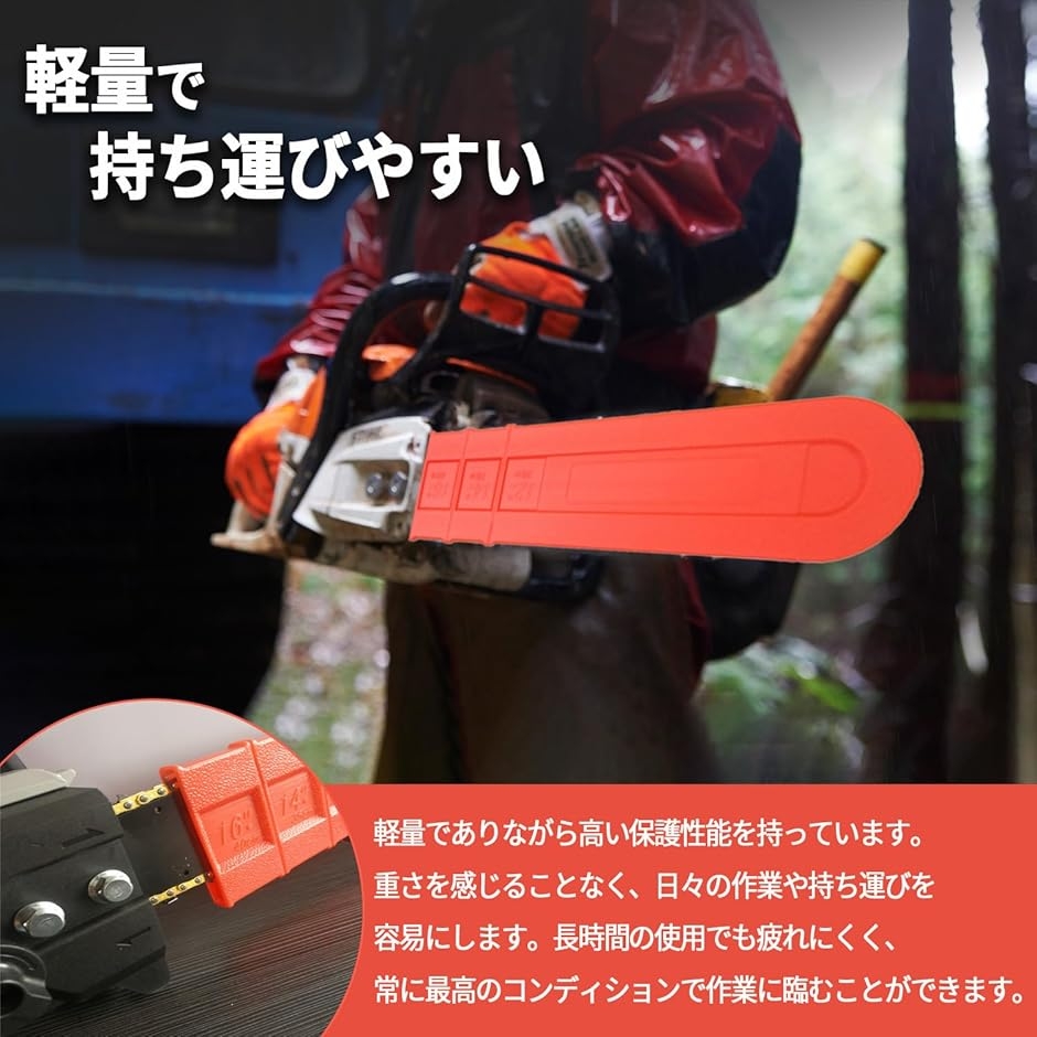 軽くて頑丈なこのカバーは、どこへでも安心してチェーンソーを携帯するのに役立ちます。