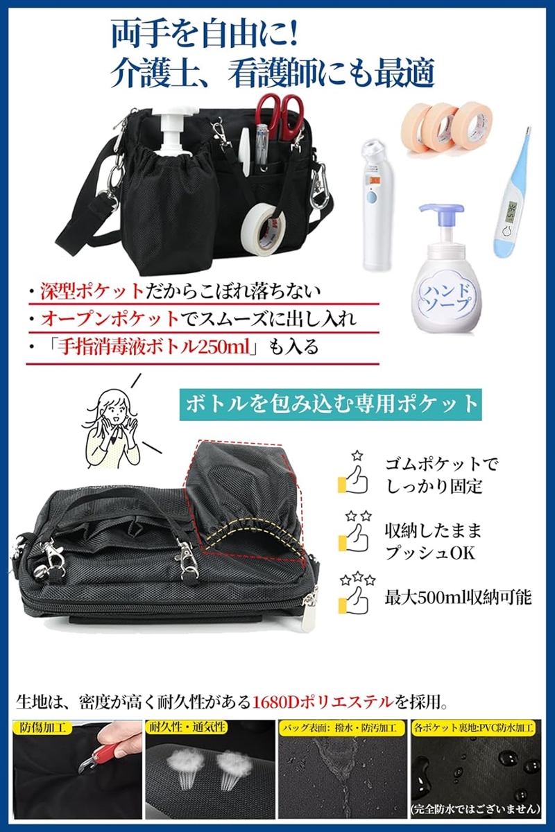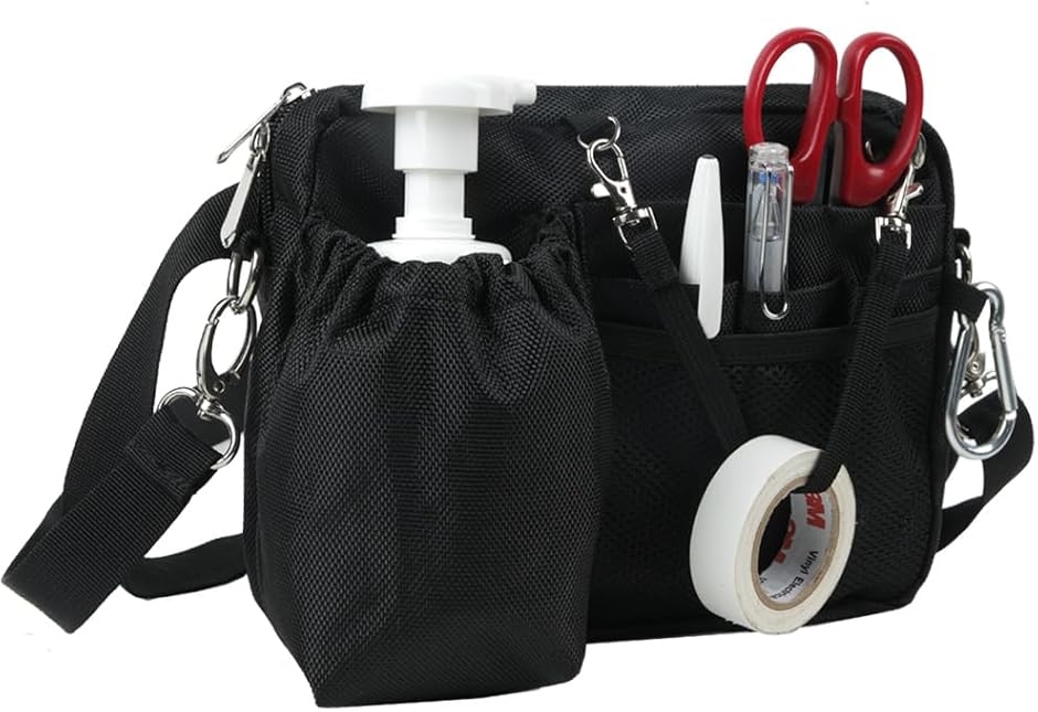 | 商品名 | 多機能エプロンバッグ ナースポーチ ウエストバッグ ウエストポーチ マチ付き 横長タイプ ダブルジッパー 11ポケット ボトルポケット付き 工具 文具 小物入れ 業務用 作業用 看護 介護 カラビナ ショルダーベルト付き 撥水 防傷加工 ブラック |