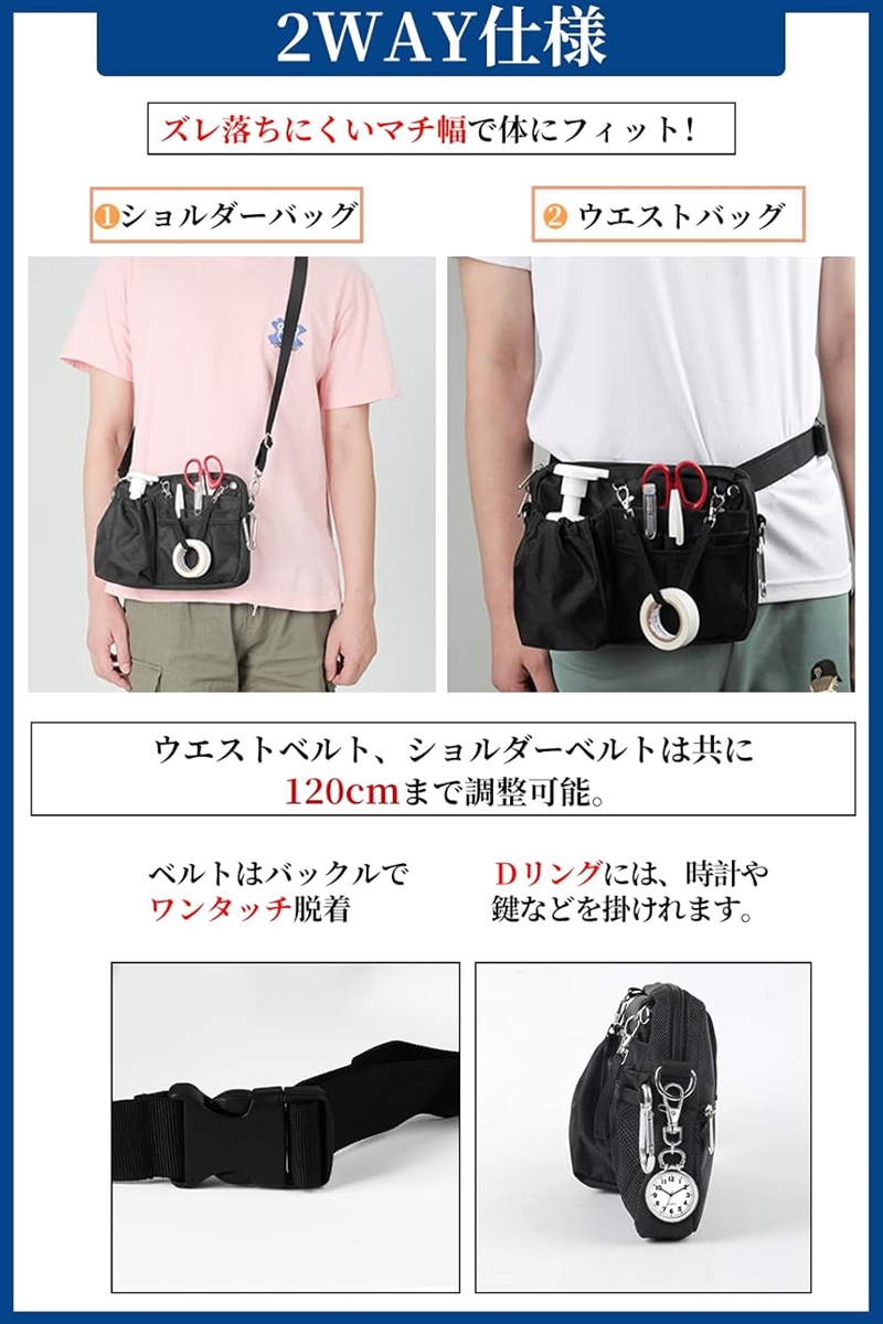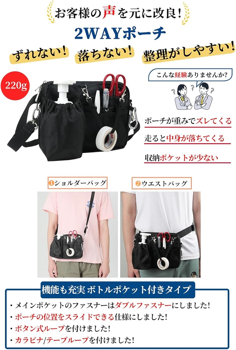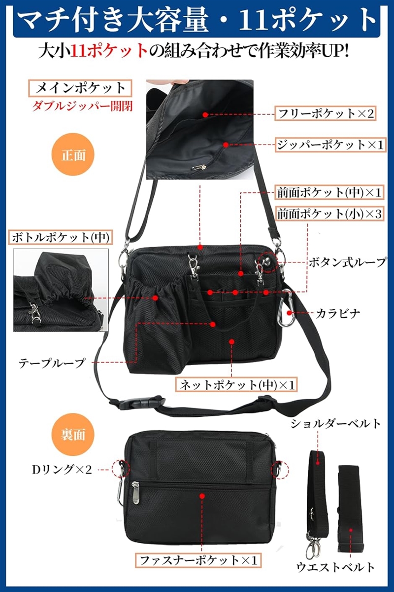 *ずれない。 落ちない。 整理がしやすい、11ポケットと多数の便利機能を兼ね備えた仕事用2WAYウエストバッグ。 「横長・ボトルポケット付きタイプ」インカムや消毒液の入る横長タイプ。
