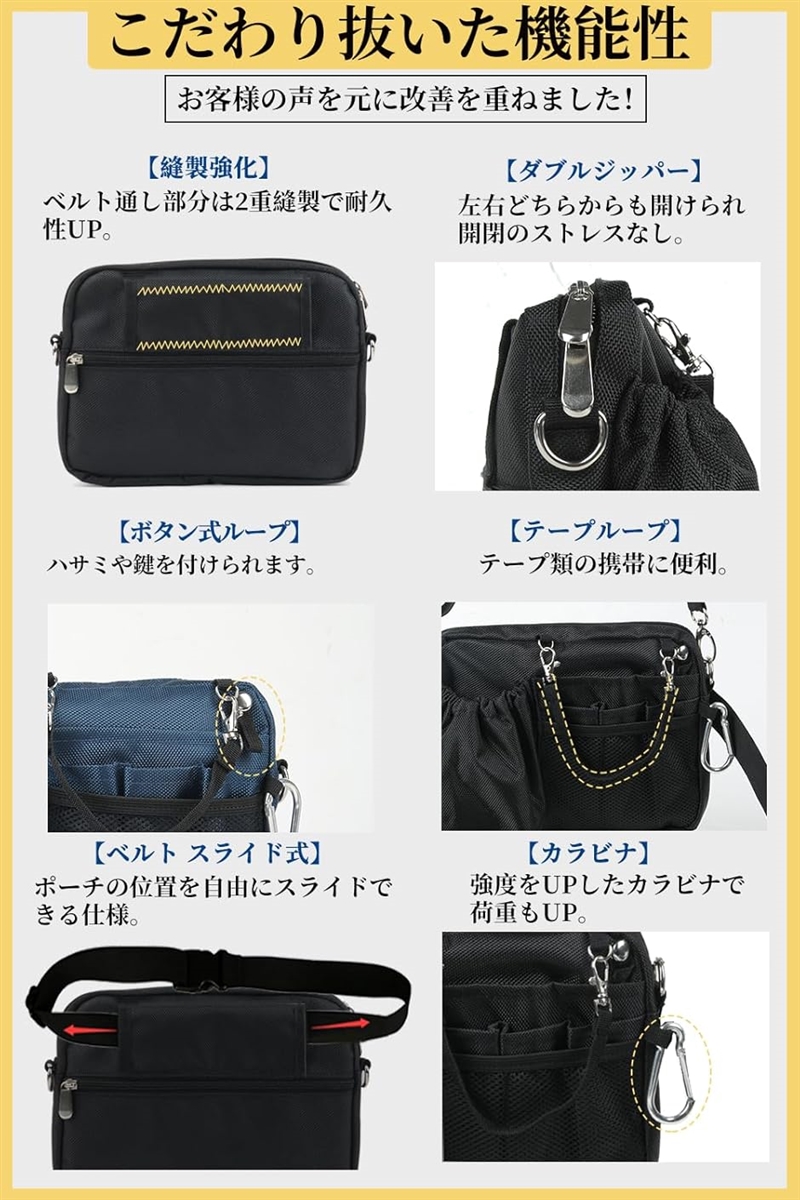 「便利な機能が多数」テープを通せるループ、時計や鍵をつけられるDカンやボタン式ループ、ベルトループに掛けバッグの位置を固定できるカラビナが付属。