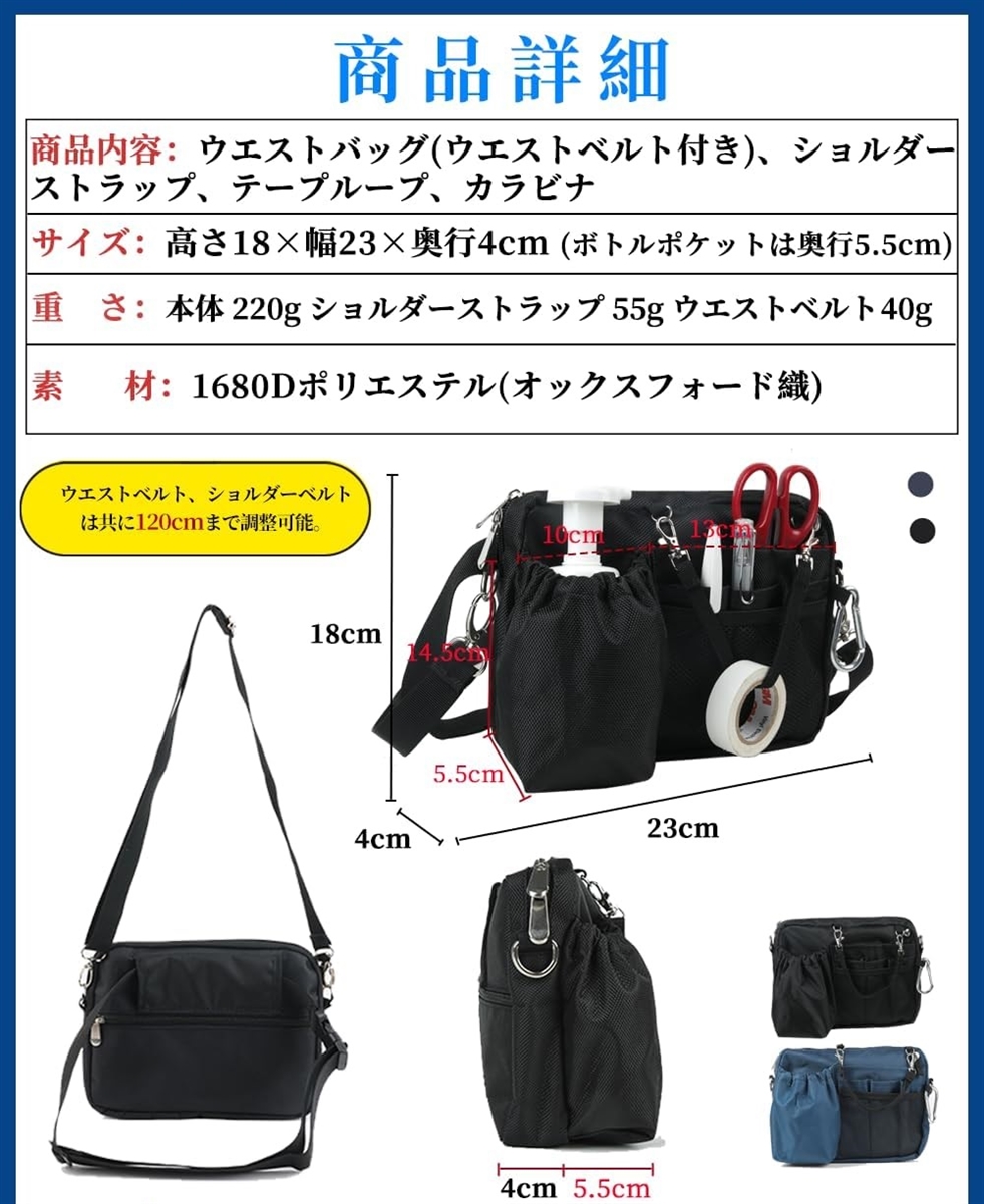 「商品詳細」商品内容:ウエストバッグ(ウエストベルト付き)、ショルダーストラップ、テープループ、カラビナ サイズ:高さ18x幅23x奥行4cm (ボトルポケットは奥行5.5cm) 重量:220g 素材:1680Dポリエステル(オックスフォード織) ウエストベルト、ショルダーベルトは共に120cmまで調整可能。