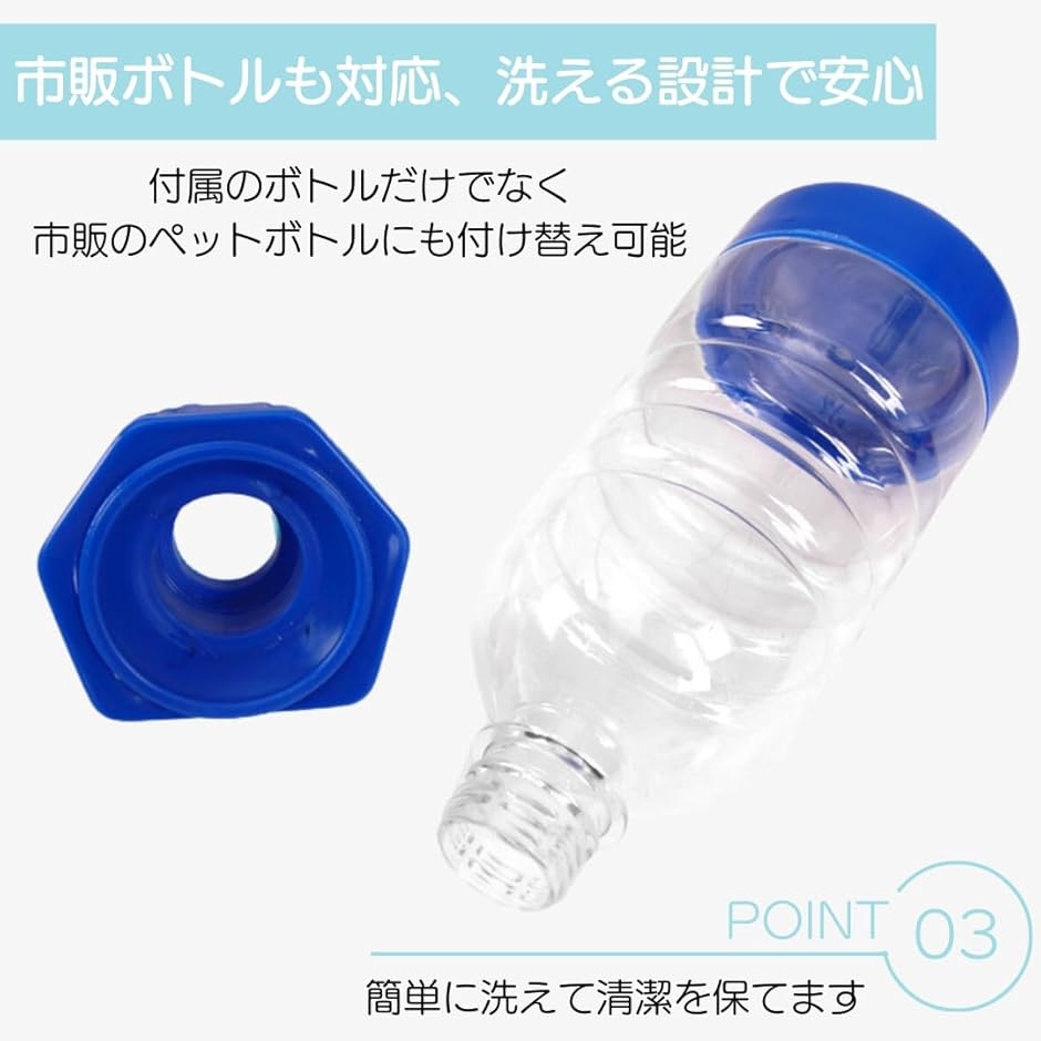 「市販ボトルも対応、洗える設計で安心」付属のボトルだけでなく、市販のペットボトルにも付け替えできます。