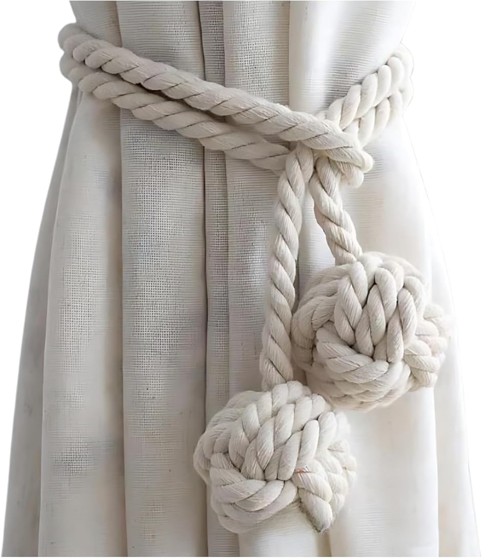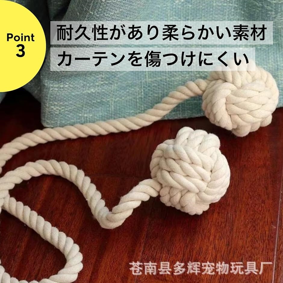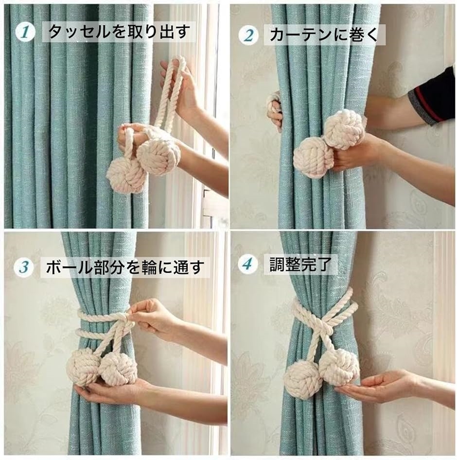 「簡単取り付けのカーテンタッセル」二つのボール状紐が付いているので、ロープを通すだけで簡単にカーテンを束ねられる便利なタッセル。