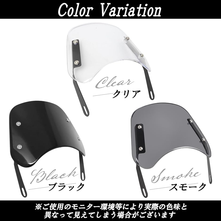 3種類のカラーバリエーション(ブラック、スモーク、クリア)がバイク全体の雰囲気をガラリと変えます。