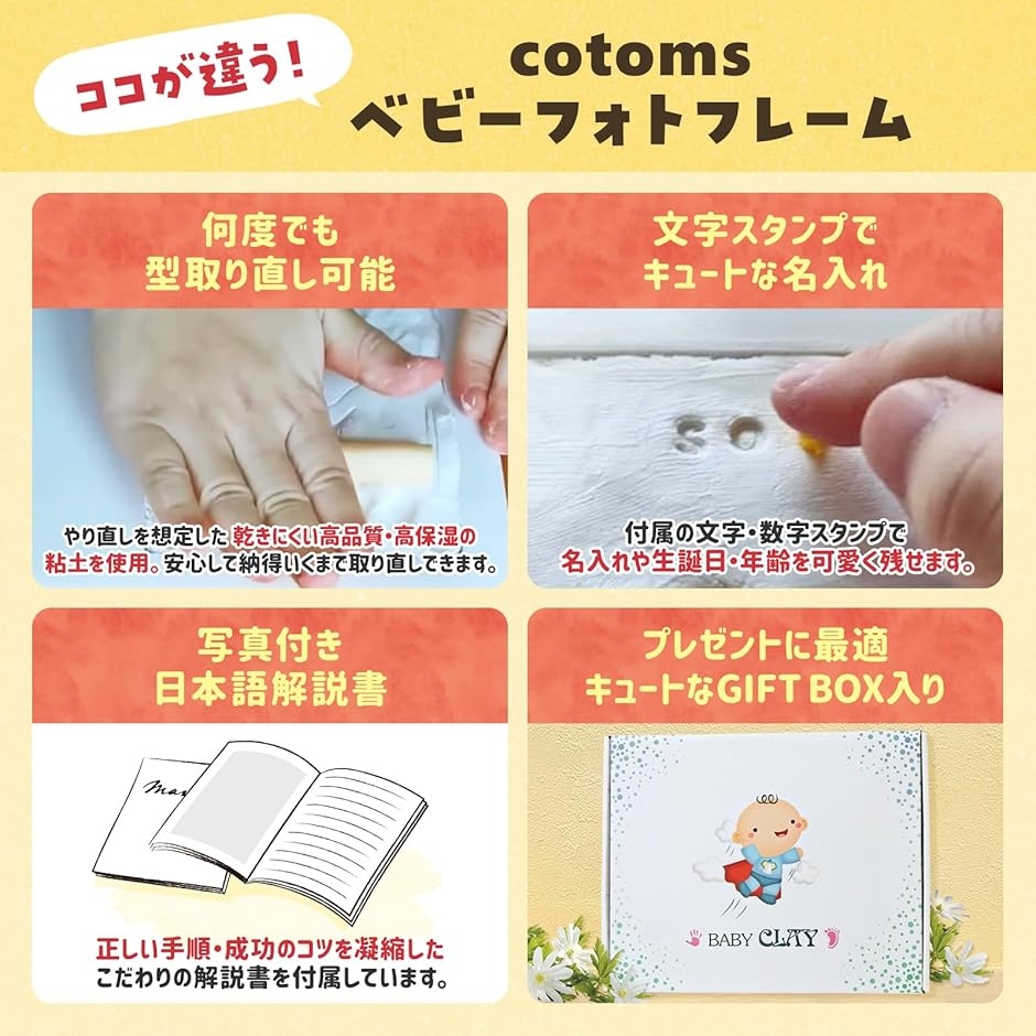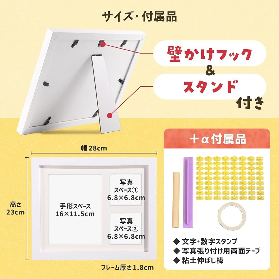 「セット内容」高保湿粘土、フレームセット(木製フレーム、アクリルパネル、粘土&写真用枠組、スタンド&壁掛けフック)、文字数字スタンプ、写真張り付け用両面テープ、粘土伸ばし棒、写真付き日本語解説書を商品に同封。