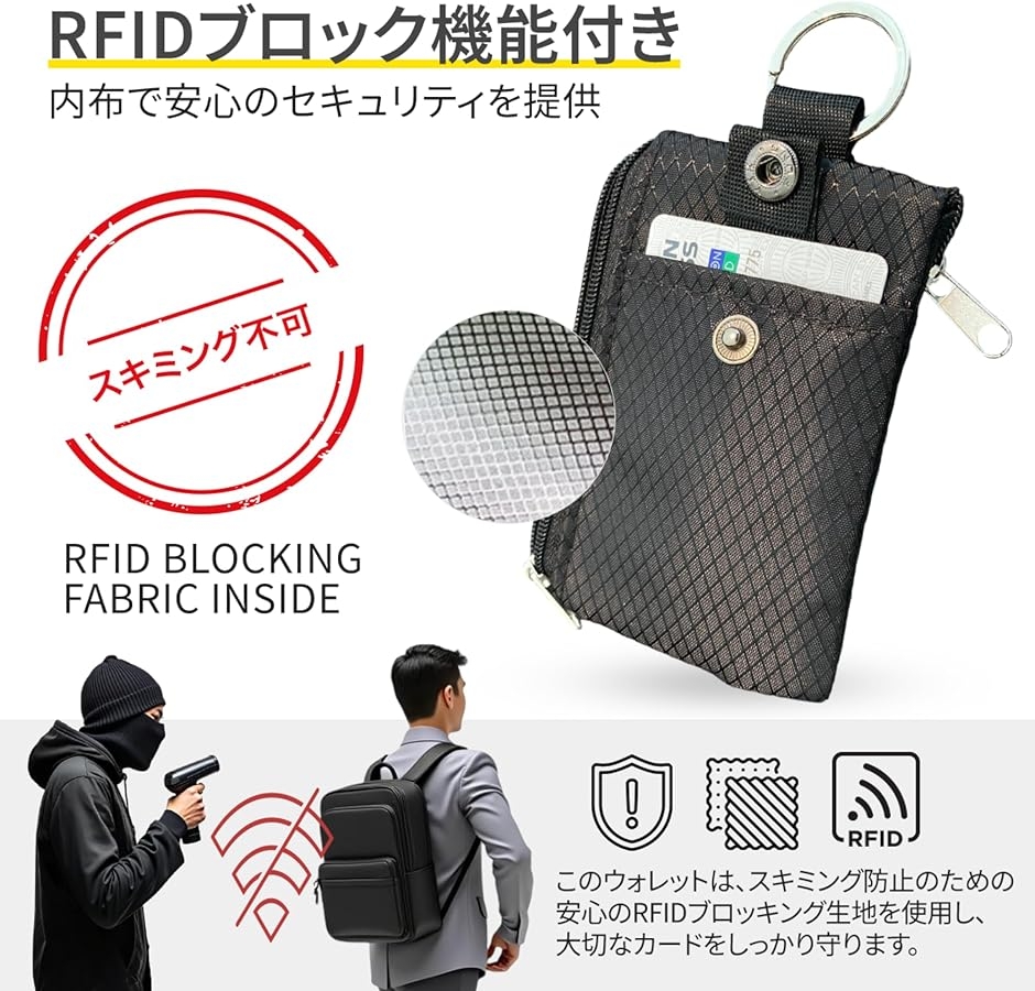 非接触でデータを読み取るRFIDをブロックする生地を使用しているため、不正に読み取られることはありません。