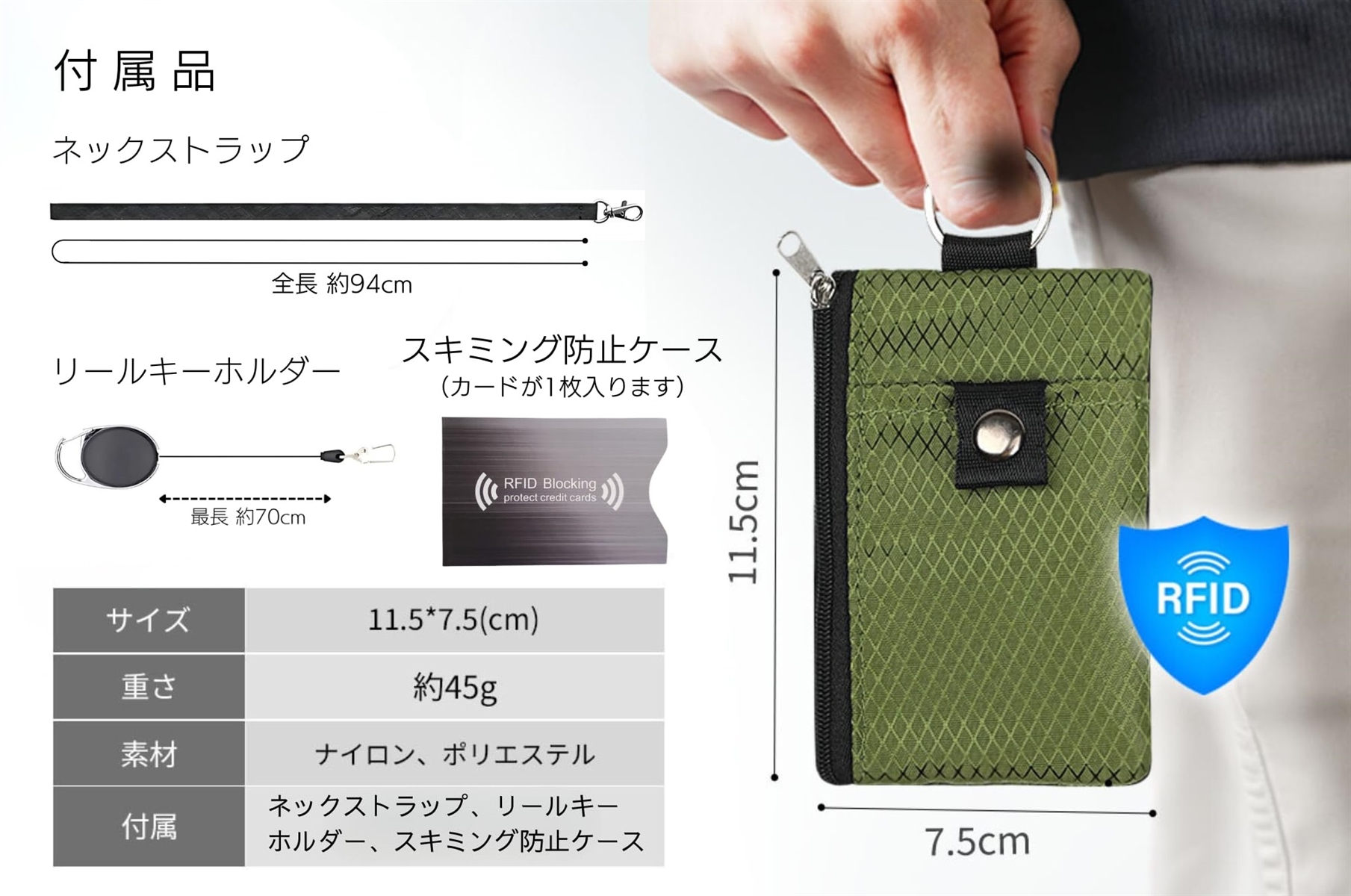 「パッケージ内容」本体、ネックストラップ(長さ約94cm)、リールキーホルダー(最長約70cm)、スキミング防止カードケース