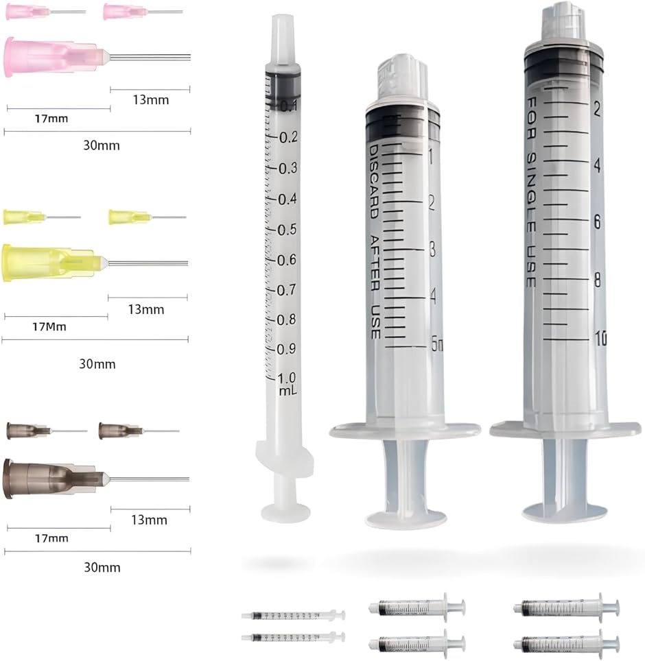 用途に合わせて選べるように、シリンジは1mL(ロックなし)、5mLと10mL(ロック付き)の3サイズ、ニードルは18G、20G、22Gの3サイズで液体の粘度に合わせて選べます。