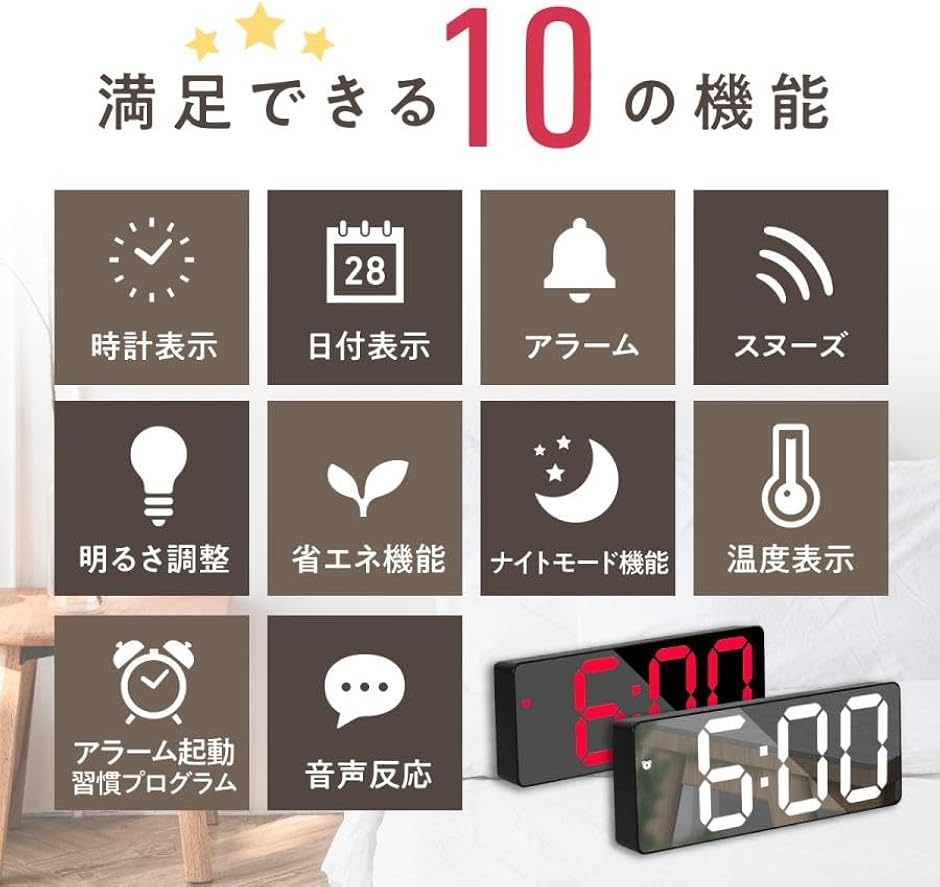 「多機能搭載で生活をサポート」時刻・日付・温度表示、アラーム、スヌーズ、明るさ調整、省エネモード、音声反応、ナイトモードなど便利な10機能を搭載。