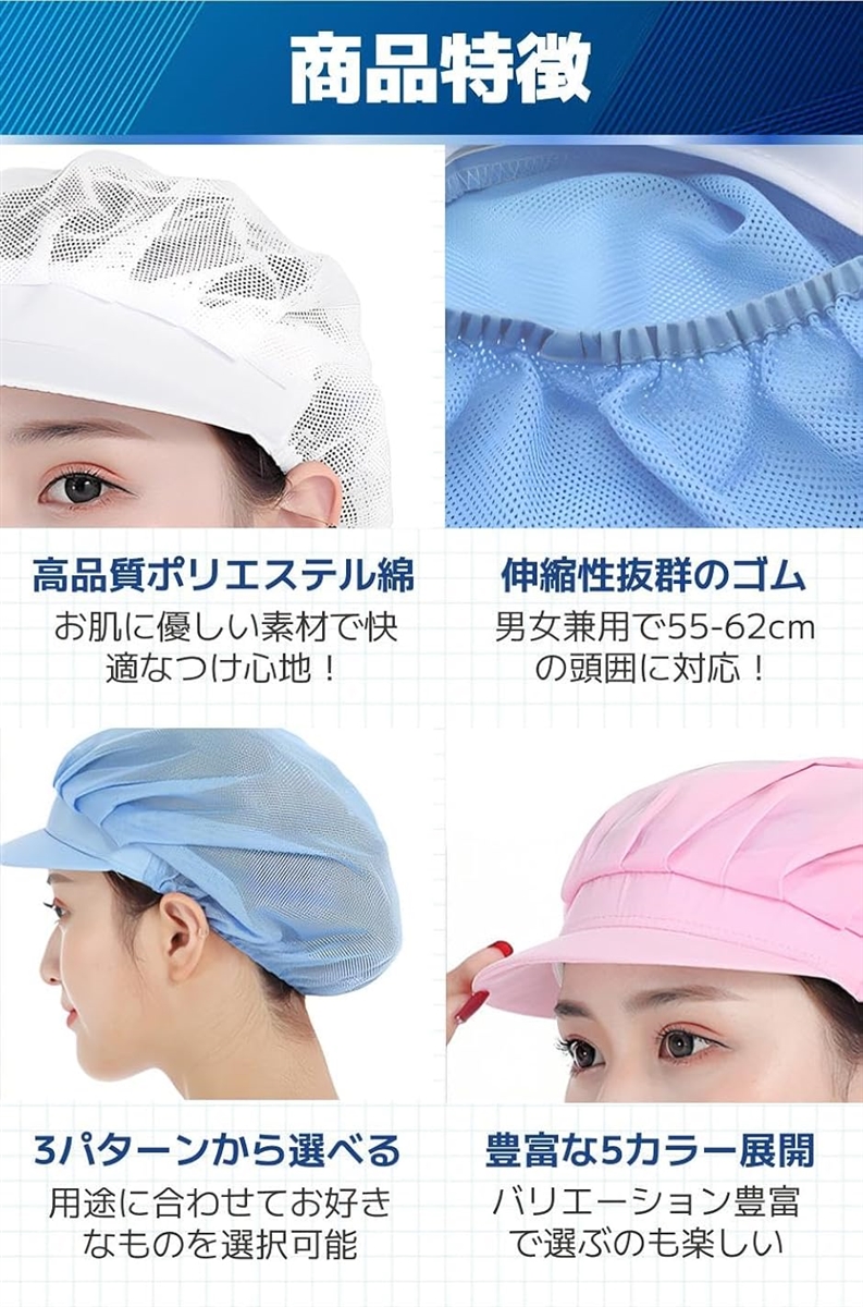 「商品特徴」(1)高品質ポリエステル綿:お肌に優しい素材で快適なつけ心地。/(2)伸縮性抜群のゴム:男女兼用で55-62cmの頭囲に対応。/(3)3パターンから選べる:用途に合わせてお好きなものを選択可能/(4)豊富な5カラー展開:バリエーション豊富で選ぶのも楽しい