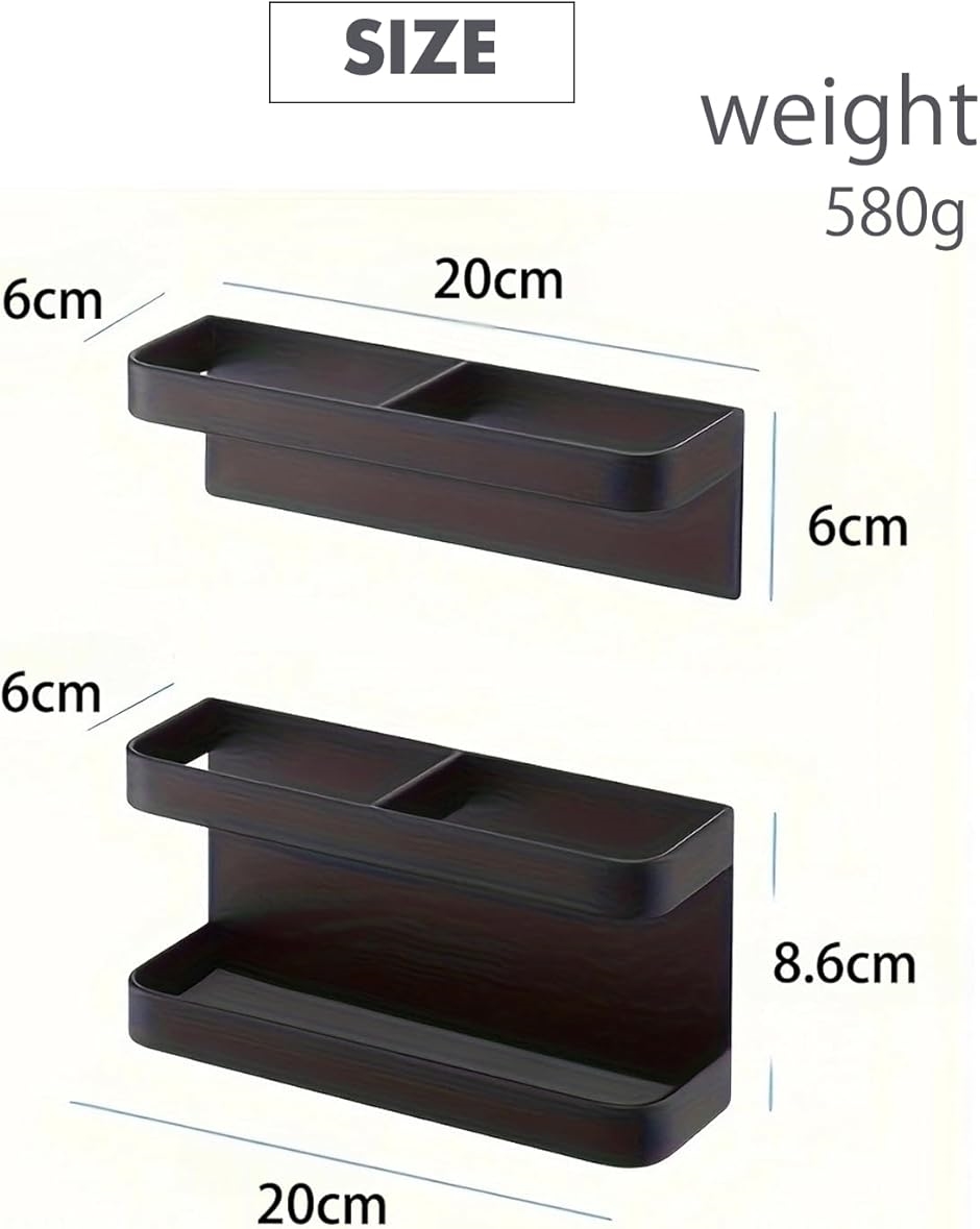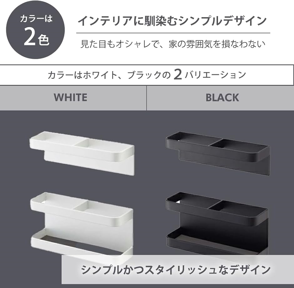 キッチンでは、冷蔵庫や電子レンジの側面に貼り付けて、スパイスボトルや調味料、飲み物などを収納できます。