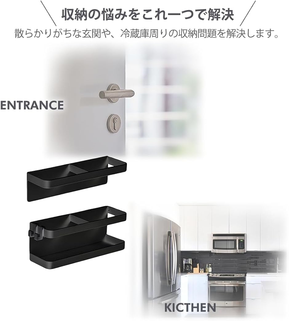 「幅広い使い道で玄関もキッチンもスッキリ収納」 玄関では、傘や鍵、マスクなどの収納に。