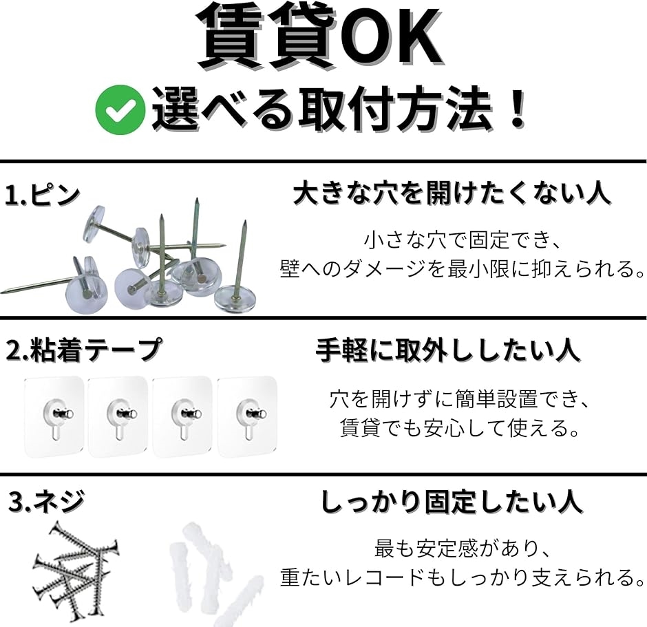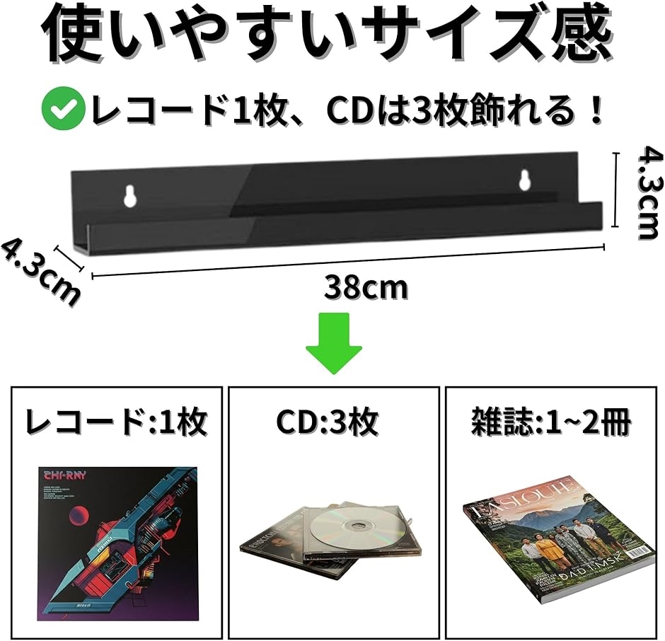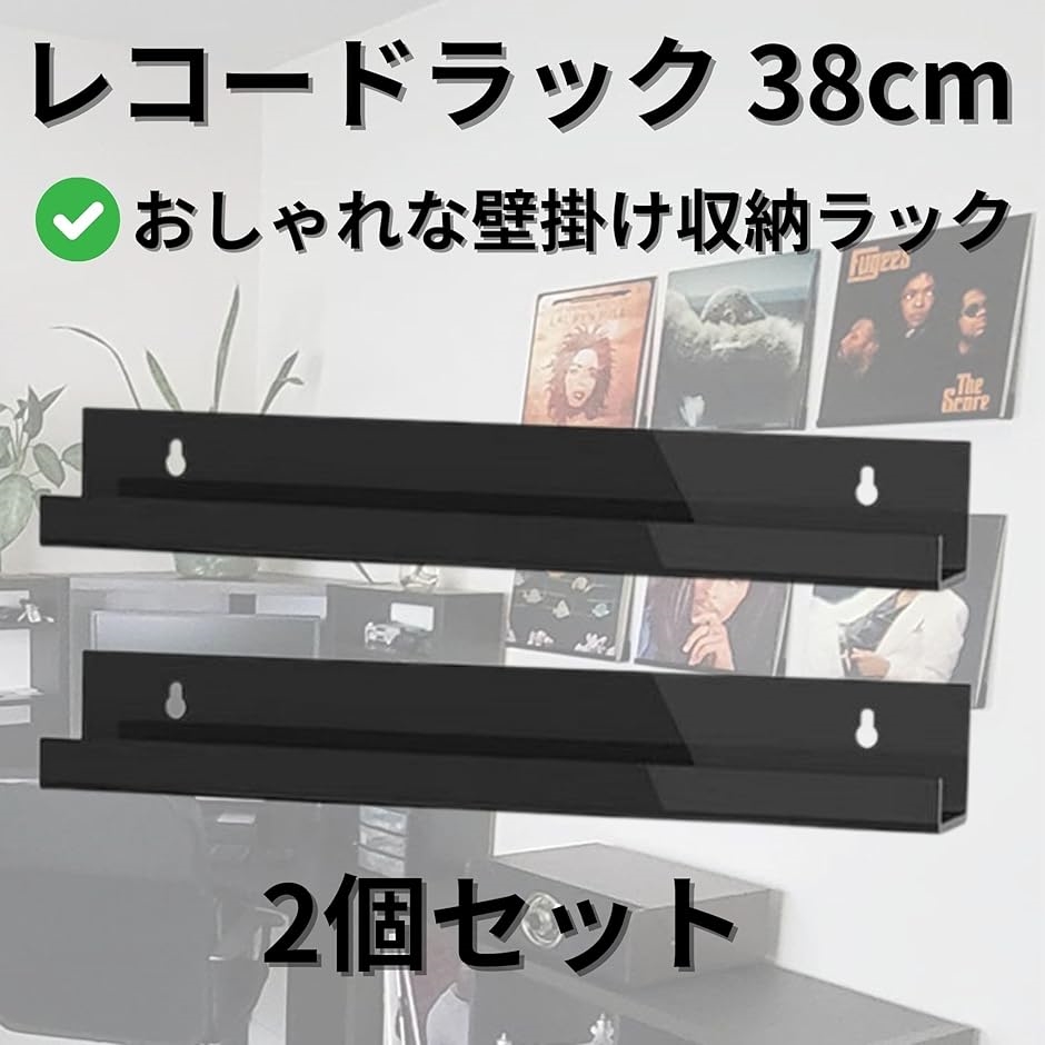 | 商品名 | レコード レコードラック 壁 幅38cm 壁掛け 賃貸可能 選べる取付方法 ピンorネジorテープ 石膏ボード 収納 アクリル TR1240 ブラック 2個 |