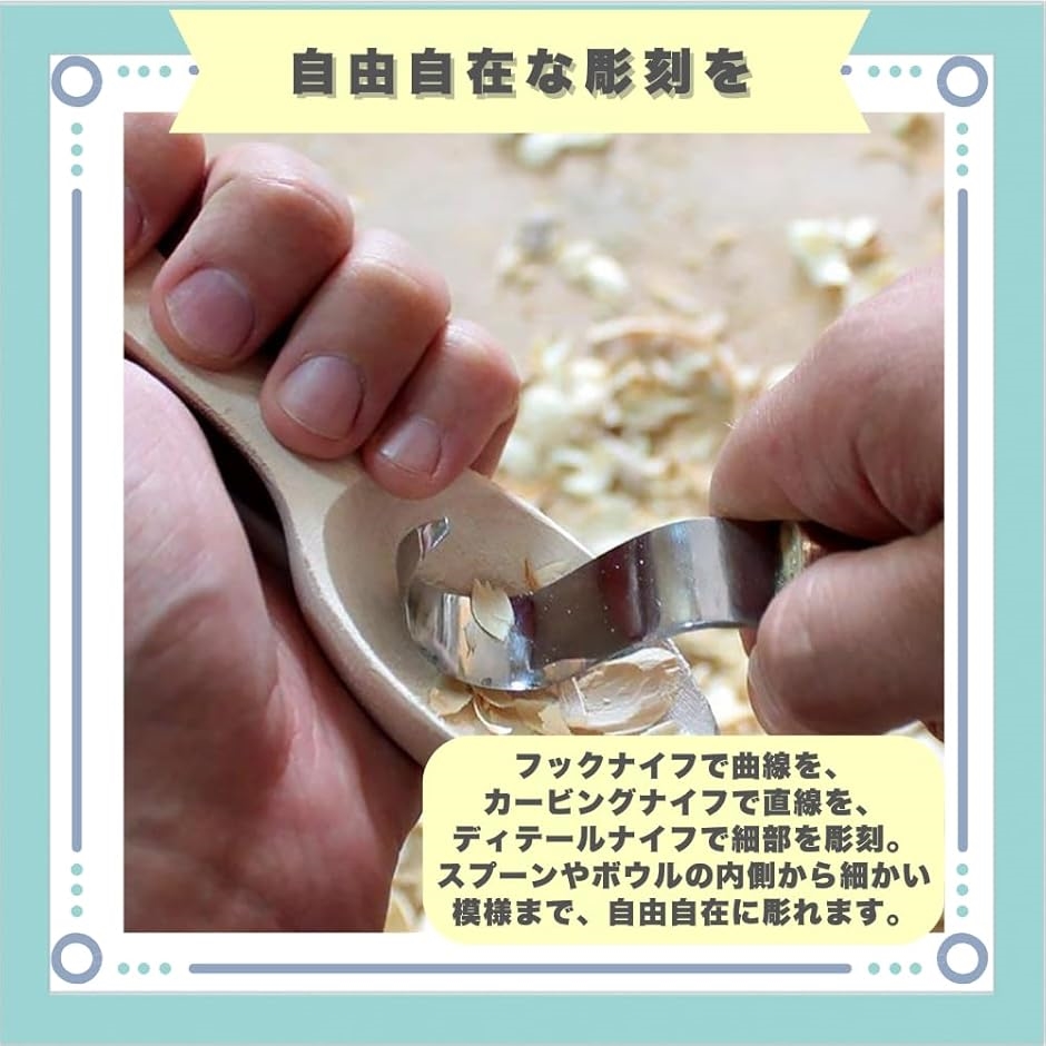 「自由自在な彫刻を」フックナイフで曲線を、カービングナイフで直線を、ディテールナイフで細部を彫刻。