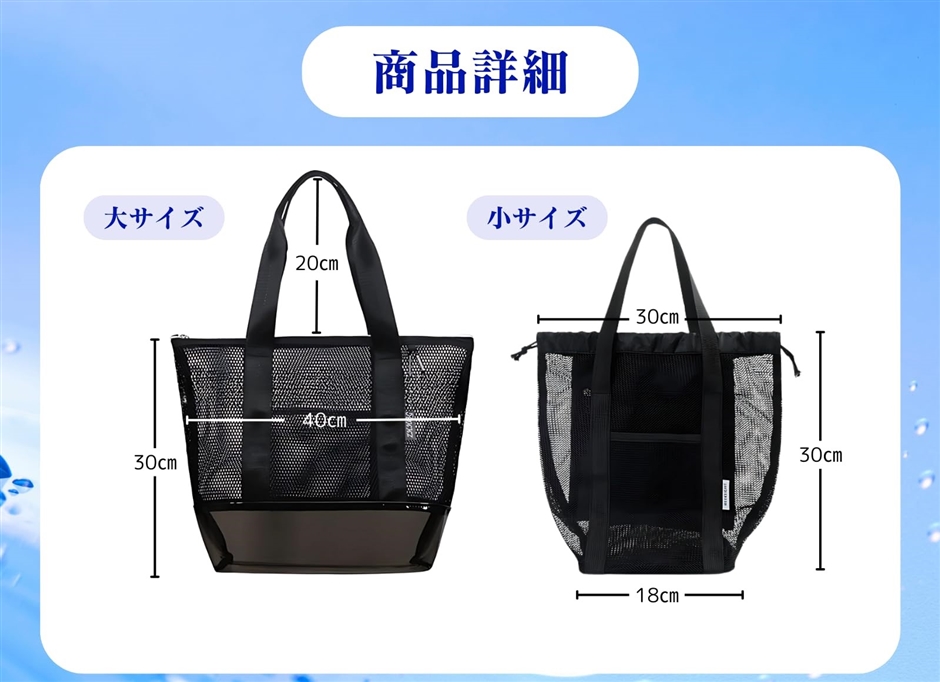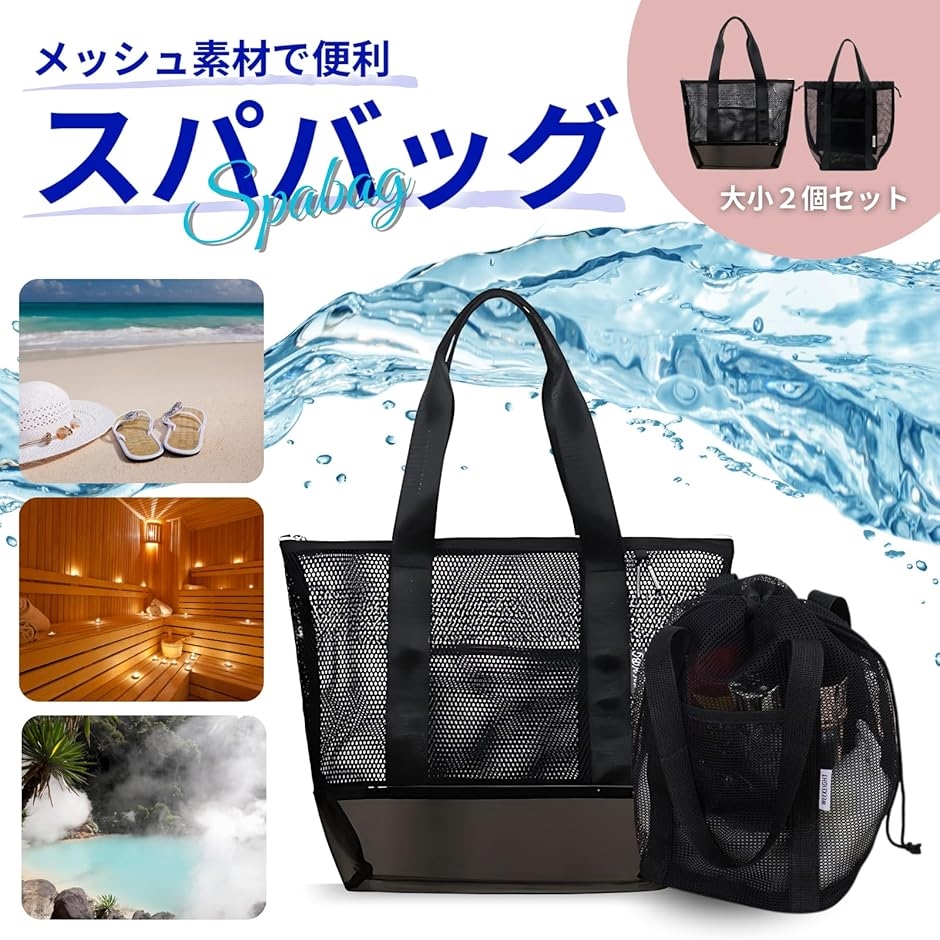 | 商品名 | スパバック サウナバック 温泉バック メッシュバック プール 銭湯 ジム 海 防水 大容量 大小 2個セット 2WAY |